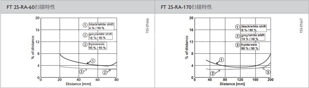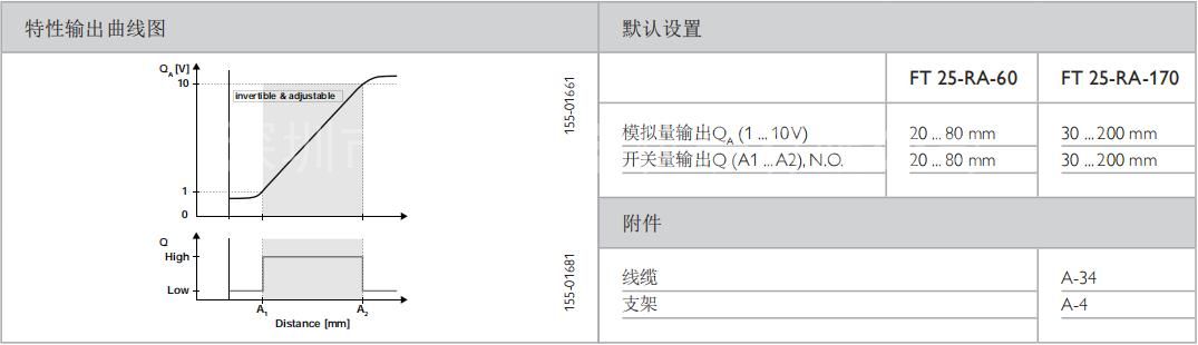 订货信息:工作范围 模拟量输出 开关量输出 连接类型 产品型号 订货编号 20...80 mm 1...10 V PNP 接口,M8×1,4-针 FT 25 RA-60-PSU-M4M 604-41000 20...80 mm 1...10 V NPN 接口,M8×1,4-针 FT 25 RA-60-NSU-M4M 604-41001 30...200 mm 1.. 10 V PNP 接口,M8×1,4-针 FT 25 RA-170-PSU-M4M 604-41002 30...200 mm 1...10 V NPN 接口,M8×1,4-针 FT 25 RA-170-NSU-M4M 604-41003