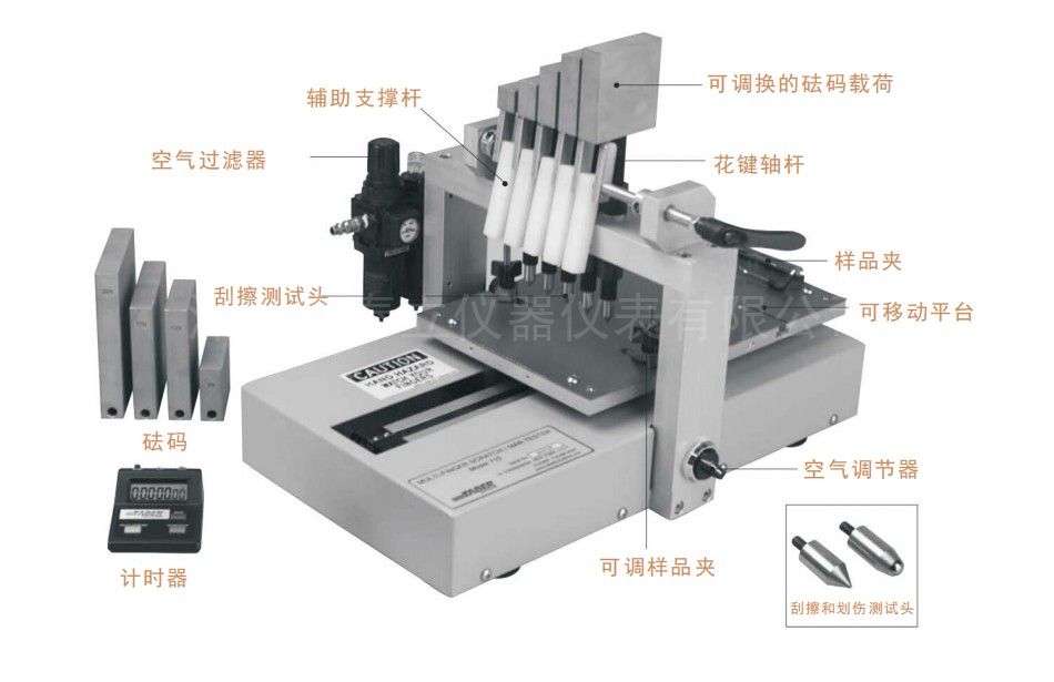 测试样品固定在空气压缩驱动的检测平台上。五根独立轴的刮指,可改变的重量和相机的刮指头,真实作用在测试样品表面。刮头安装在正确的台架上,操作人员可通过移动使刮指头固定在平衡位置,从而使不规则的样品也可以进行测试。