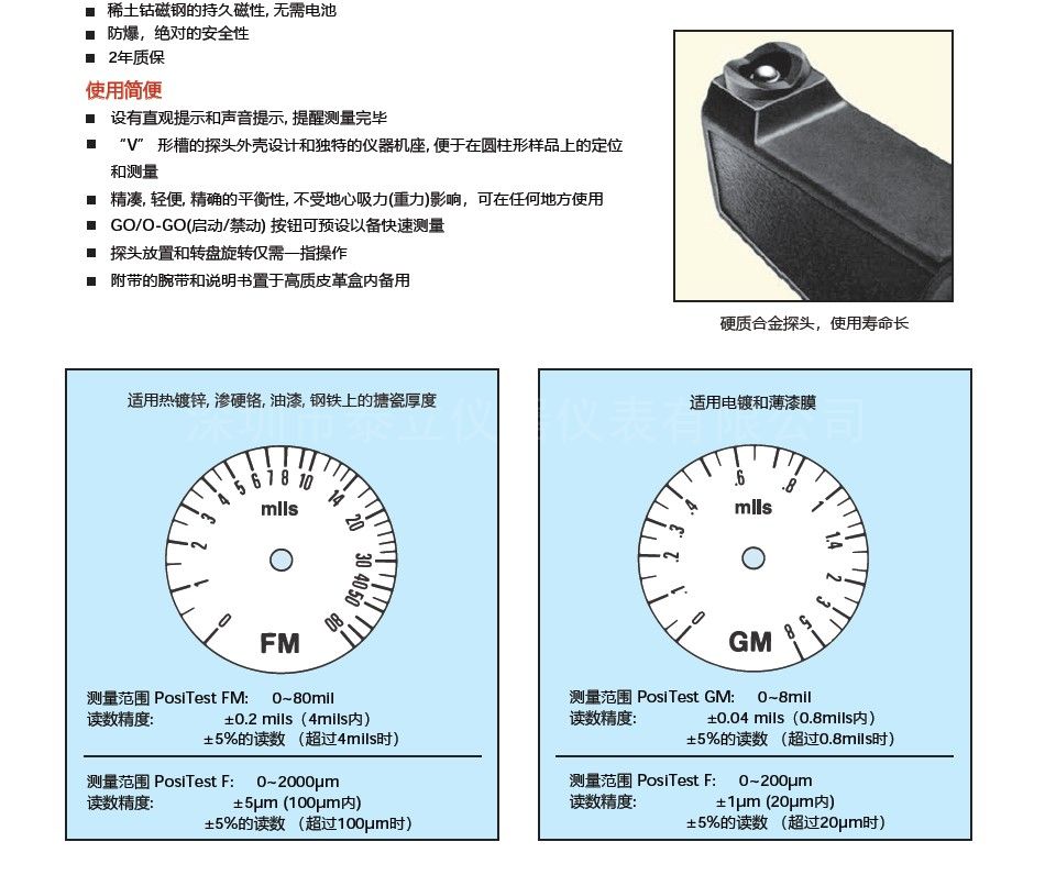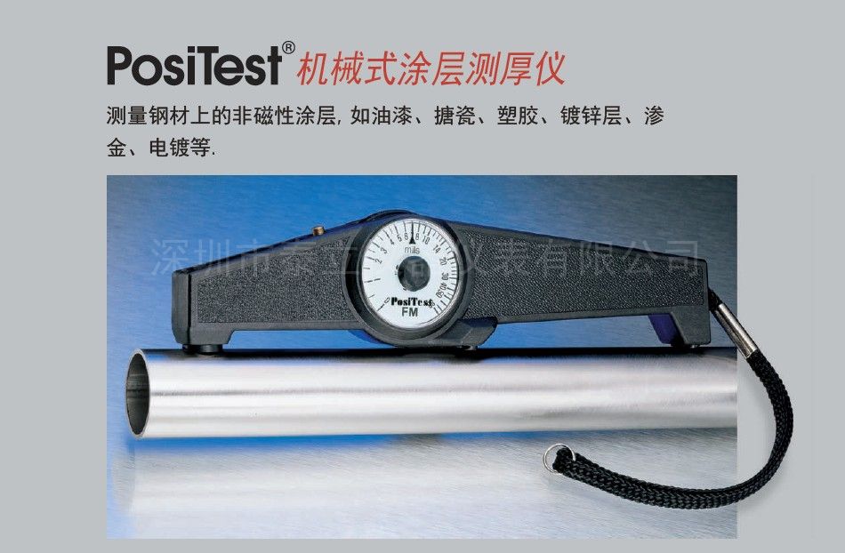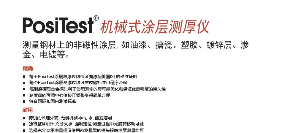 美国DeFelsko PositeTest 涂层测厚仪,用于无损测量铁基上的非磁性涂层厚度(如油漆、珐琅、镀层等),稳定可靠,尾部支撑测量过程中不会晃动,达到涂层厚度时,探头回弹,V型槽可以对圆柱形产品准确定位。