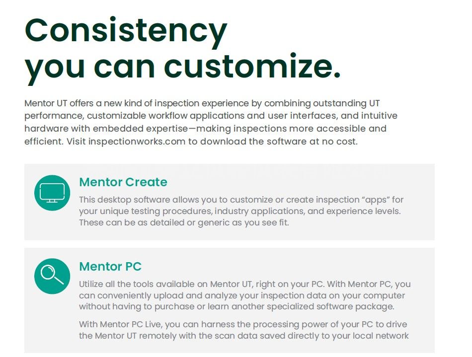 整套 UT 探伤仪使用戴手套也可轻松操作的触摸屏平板屏幕,就像智能手机一样容易操作。 预装使用 Mentor Create 软件编制的检测应用程序,允许用户自定义菜单和工作流程(应用程序),以逐步指导完成从校准、缺陷定位到分析的整个检测过程。 充满信心和受过培训的用户意味着,即使是*复杂的检测也都能始终如一地进行。