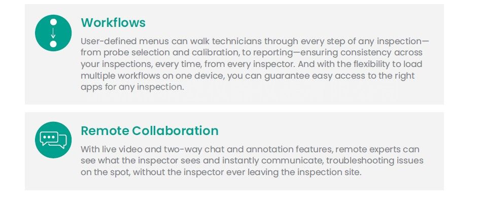 用户定义的菜单可以引导技术人员完成任何检测的每一个步骤(从探头选择和校准到报告)确保每名检测人员每次检测的一致性。 而且,由于可以灵活地在一台设备上加载多个工作流程,因此能保证轻松访问任何检测的正确应用程序
