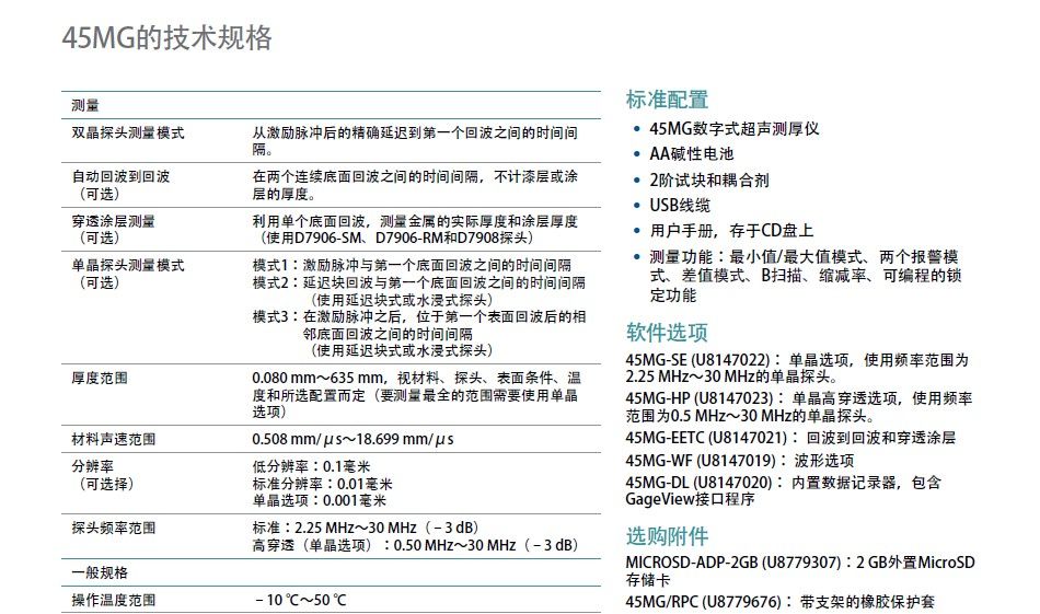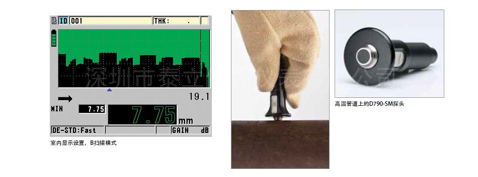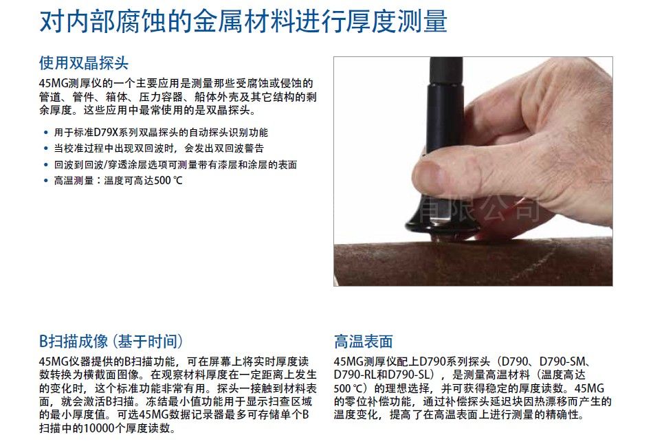 45MG测厚仪配上D790系列探头(D790、D790• -SM、•D790-RL和D790-SL),是测量高温材料(温度高达•500•℃ )的理想选择,并可获得稳定的厚度读数。45MG的零位补偿功能,通过补偿探头延迟块因热漂移而产生的温度变化,提高了在高温表面上进行测量的精确性。 -