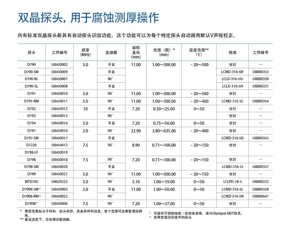 • 用于标准D79X系列双晶探头的自动探头识别功能