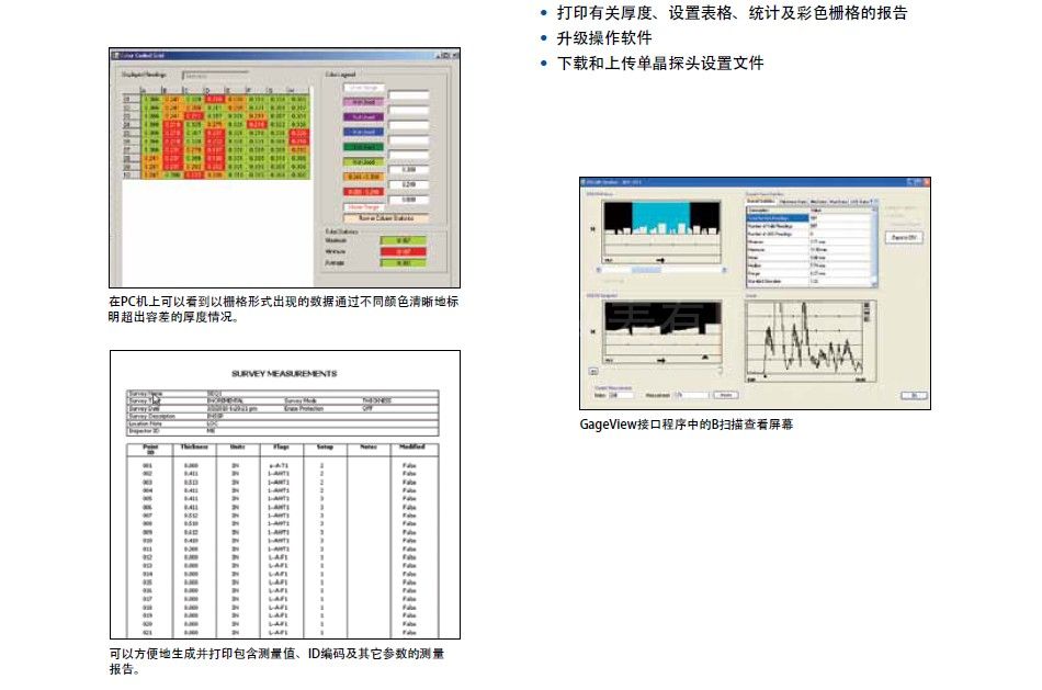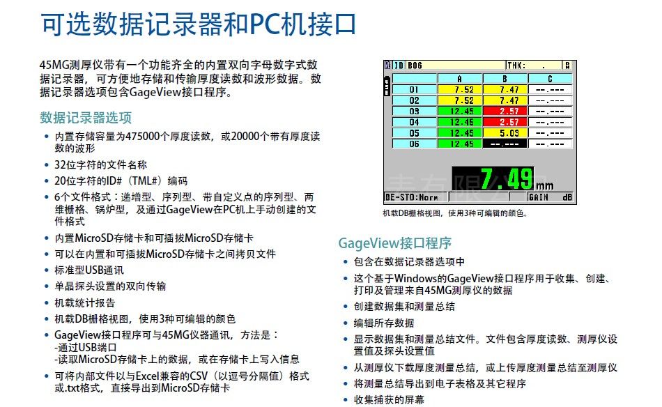 45MG仪器提供的B扫描功能,可在屏幕上将实时厚度读数转换为横截面图像。在观察材料厚度在一定距离上发生的变化时,这个标准功能非常有用。探头一接触到材料表面,就会激活B扫描。冻结*小值功能用于显示扫查区域的*小厚度值。可选45MG数据记录器*多可存储单个B扫描中的10000个厚度读数。