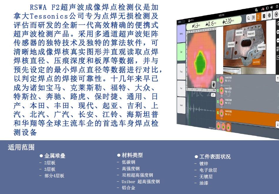 RSWA F2RSWA F2超声波成像焊点检测仪是加拿大Tessonics公司专为点焊无损检测及评估而研发的全新一代高效精确的便携式。