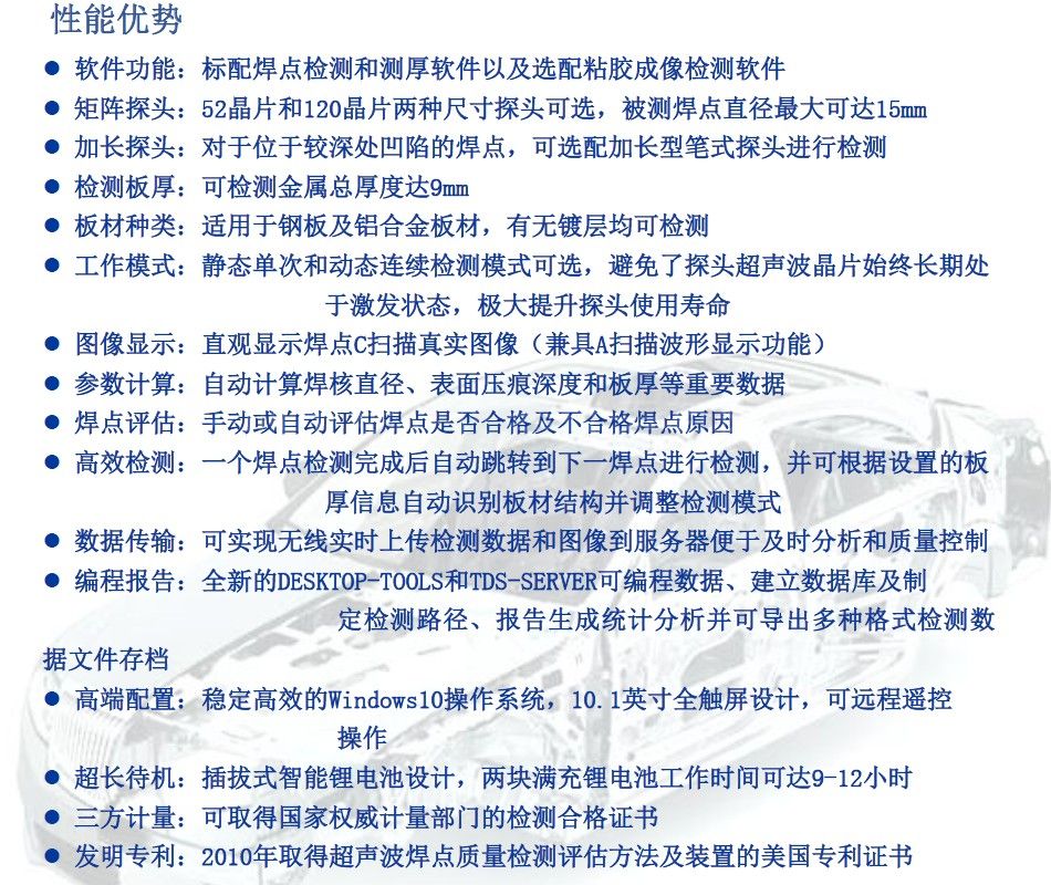超声波检测产品。采用多通道超声波矩阵传感器的独特技术及独特的算法软件,可清晰地成像焊核真实图形并直观读取点焊。