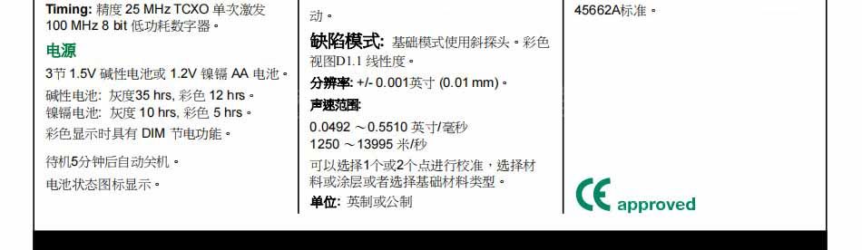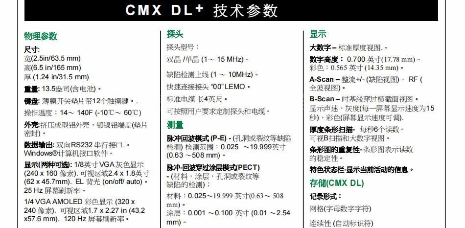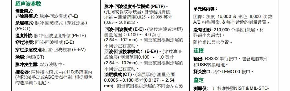 测量范围:脉冲回波模式(P-E):(坑及探伤)0.025 19.999英寸(0.63毫米至500毫米)的措施。