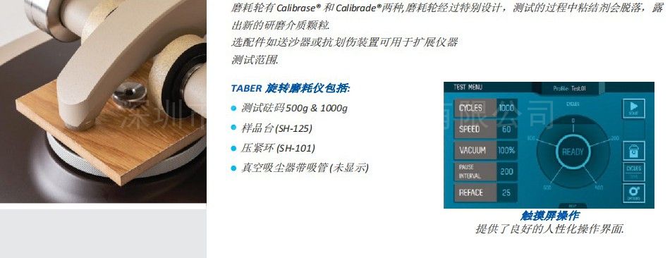 两个TABER原厂研磨轮,在特定的压力下压到样品表面上。转盘旋转时,样品驱动磨耗轮以相反的方向从样品的轴切线方向转动。一个磨耗轮向外转动,另一个向内转动。同时由吸尘器将摩擦产生的颗粒吸走。
