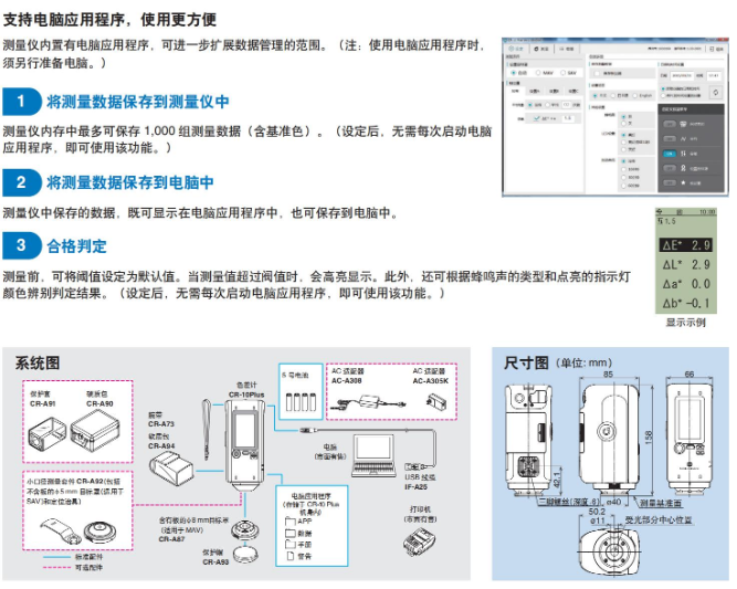柯尼卡 美能达CR-10 Plus支持电脑应用程序,使用更方便测量仪内置有电脑应用程序,可进一步扩展数据管理的范围。(注:使用电脑应用程序时,须另行准备电脑。)