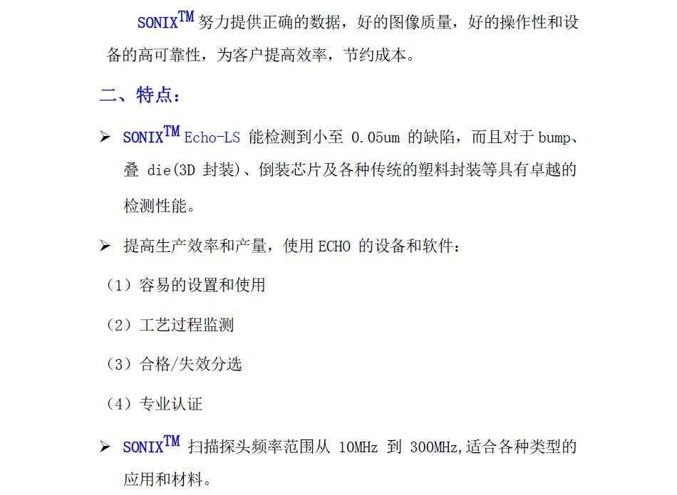 三、SONIX Echo-LS 能检测到小至 0.05um 的缺陷,而且对于bump、叠 die(3D 封装)、倒装芯片及各种传统的塑料封装等具有卓越的检测性能。