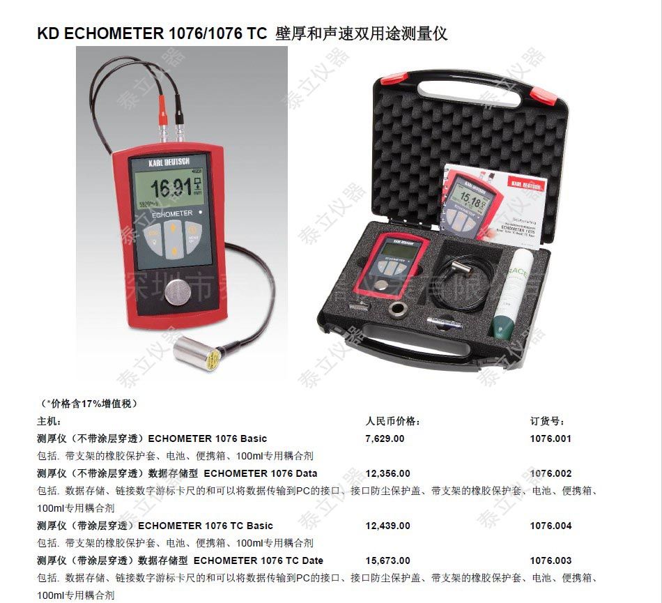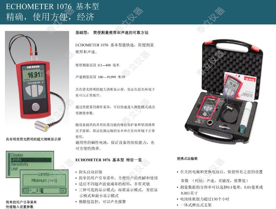 德国卡尔德意志 超声波测厚仪1076 1077创新采用声速和壁厚双重检测的超声波检测仪。它操作简单,用户只要在菜单上点击几下就能使用ECHOMETER1076 BASIC超声波测厚仪进行测厚作业。