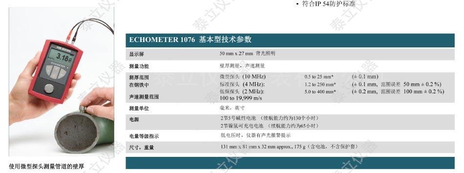三种可选的显示模式:标准显示模式,差值显示模式和zui小显示模式。极限值监控,可以声光报警根据需要进行声速测量,测量数据的分辨率可以选择0.1毫米,0.01毫米或0.001英寸,可以设置电源自动关闭功能,节省电能