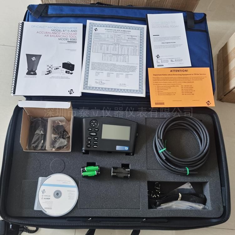 8715型DP-CALC微型风压计、携带箱、457mm毕托管、两个静压探头、5m长Neoprene管、电池充电器(内部和外部)、4节AA可充电NiMH电池、AC适配器、LogDat软件、NIST校准证书、产品手册。