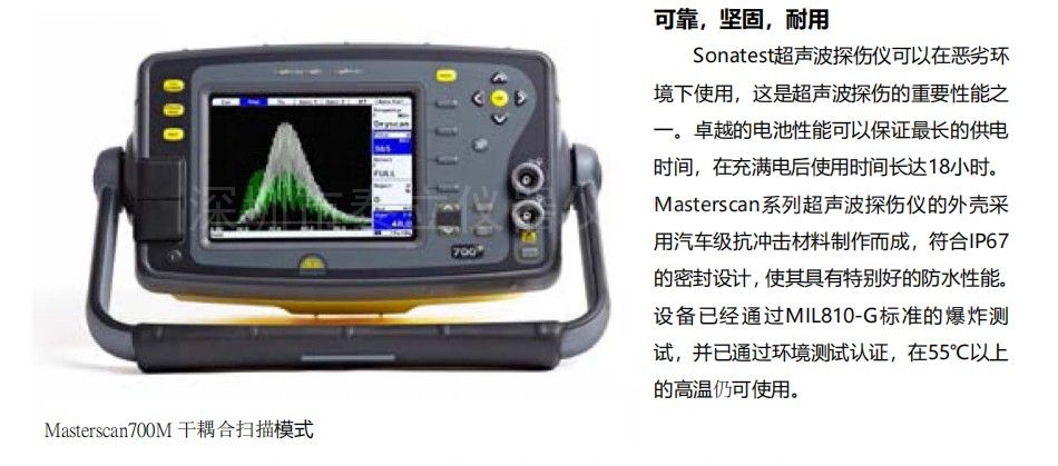 Sonatest超声波探伤仪可以在恶劣环境下使用,这是超声波探伤的重要性能之一。***的电池性能可以****长的供电时间,在充满电后使用时间长达18小时。Masterscan系列超声波探伤仪的外壳采用汽车级抗冲击材料制作而成,符合IP67的密封设计,使其具有特别好的防水性能。设备已经通过MIL810-G标准的爆炸测试,并已通过环境测试认证,在55℃以上的高温仍可使用。Masterscan系列探伤仪配有彩色VGA显示屏,确保在任何光线条件下仪器都能够清晰显示。内置9种背光颜色可供选择,用户可根据需要调节背光亮度以确保清晰显示,也有灰度LCD显示模式可供选择。