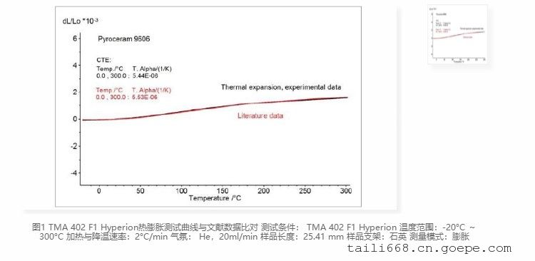 Pyroceram是康宁公司开发的多晶型硅酸镁铝微晶玻璃。此材料密度低、耐高温达1000°C,同时还具备类似钢材等金属合金的力学性能,因而广泛应用于厨具、实验室加热盘等。美国航天局NASA采用此材料制造轻量化且满足相应热学和力学性能要求的零部件。 Pyroceram 9606具有稳定良好的高温热传递性能(包括导热和热扩散)而被批准为标准材料,它由NPL(UK)公司制造,标号BCR-724,由IRMM发行销售。热膨胀仪(DIL)和热机械分析仪(TMA)是测量Pyroceram和其他玻璃陶瓷材料热膨胀的理想方法。 图谱1显示了Pyroceram 9606样品的实测热膨胀曲线(黑色)和文献数据(红色)比对,两条数据曲线十分吻合,说明TMA 402 F1 Hyperion能够获得很高的测试准确度。实测的平均热膨胀系数(0°C~300°C)为5.44 X 10-6 1/K,而文献数据为5.53 X 10 -6 1/K,两者只相差0.9 X 10-7 1/K。