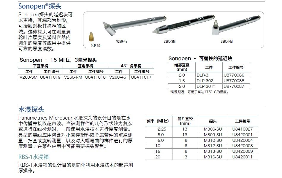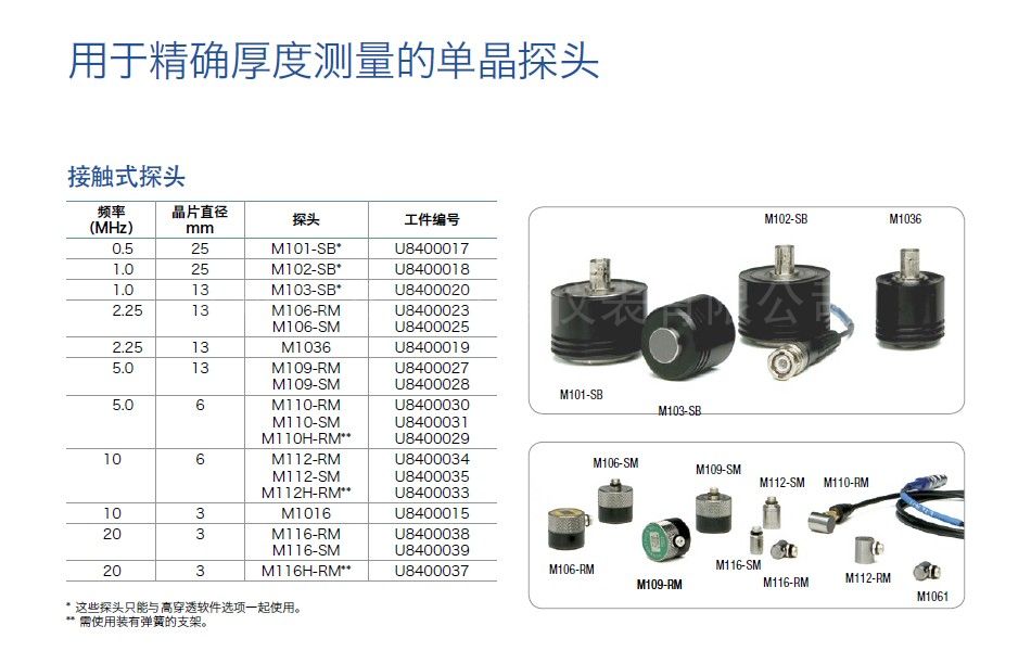 频率(MHz) 晶片(英寸) 直径(毫米) 探头工件编号 探头订购编号 0.5 1 25 M101-SB† U8400017 1 1 25 M102-SB† U8400018 1 0.5 13 M103-SB† U8400020 2.25 0.5 13 M106-RM、M106-SM U8400023、U8400025 2.25 0.5 13 M1036 U8400019 5 0.5 13 M109-RM、M109-SM U8400027、U8400028 5 0.25 6 M110-RM、M110-SM、M110H-RM U8400030、U8400031、U8400029 10 0.25 6 M112-RM、M112-SM、M112H-RM U8400034、U8400035、U8400033 10 0.125 3 M1016 U8400015 20 0.125 3 M116-RM、M116-SM U8400038、U8400039 20 0.125 3 M116H-RM* U8400037 RM = 直角型Microdot;SM = 平直型Microdot;SB = 平直型BNC† 高穿透性探头 使用探头架,工件编号为2133 使用探头架,工件编号为2132