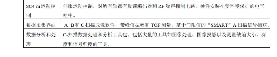 每一台系统包括一个集成的 usc-100a 超声设备,装有 RPP3 方波脉冲前置放大器的扫描管、每一个轴的高精度伺服运动控制,以及用于工件设置、扫描、检测分析和获取数据的ScanMaster 软件。