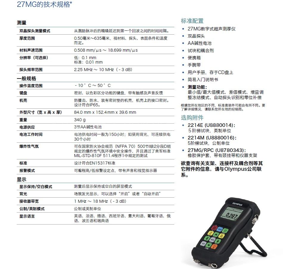 详细信息| 询价留言品牌:Olympus 加工定制:否 型号:27MG 类型:超声波 测量范围:根据探头 mm 显示方式:数字 电源电压:3 V 外形尺寸:84*152.4*39.6 mm 显示方式:数字 -