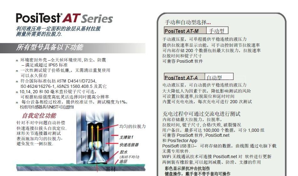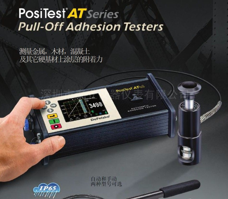 美国DeFelsko公司PosiTest AT-A(自动测量)AT-M(手动测量) 数字显示拉拔式附着力测试仪可测量金属、混凝土及其他材质涂层的附着力--自我定位特性为附着力的测量方式带来了全新的变革。测量将单位面积的涂层从基体分离所需要的拉力,以MPa或psi表示,符合ATSM D4541和ISO 4624标准。