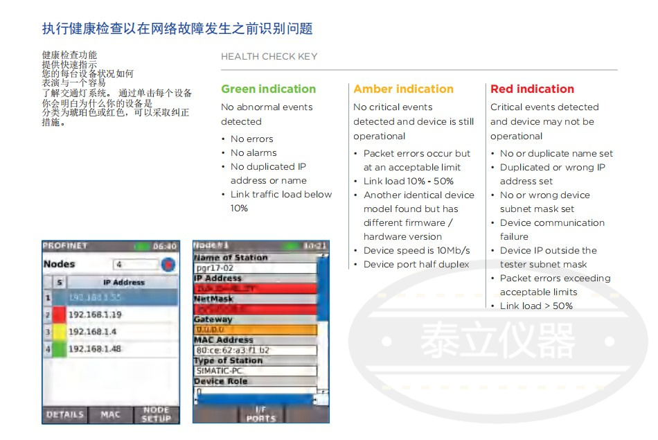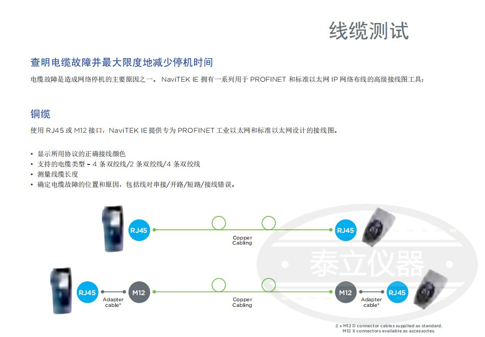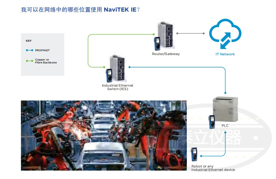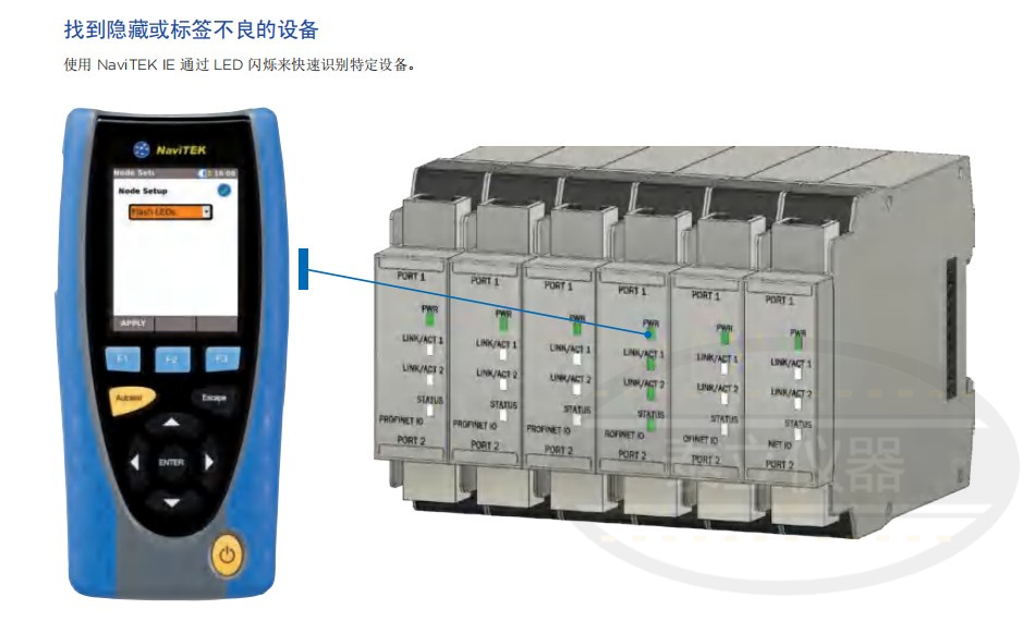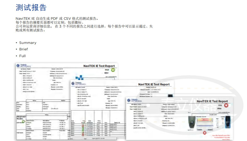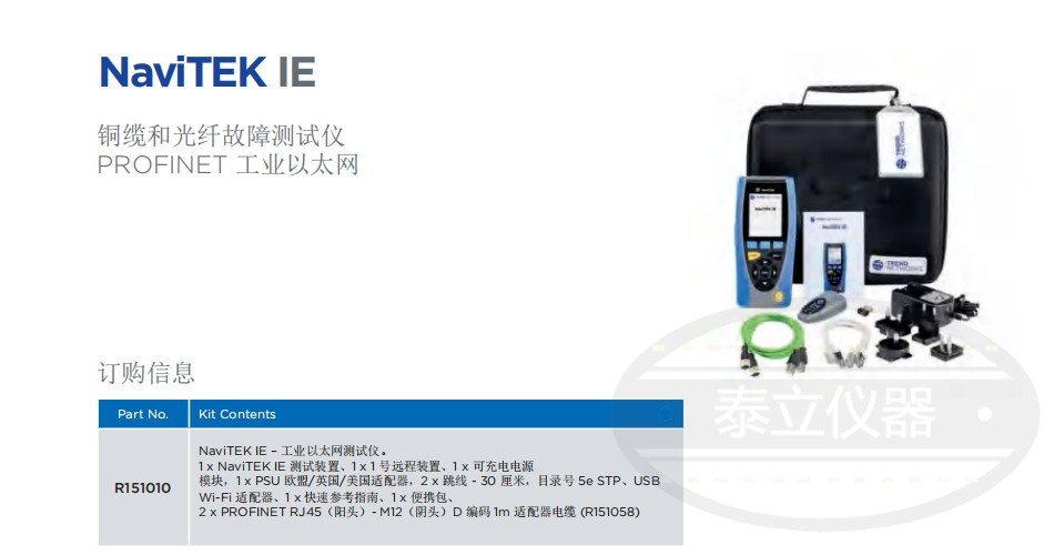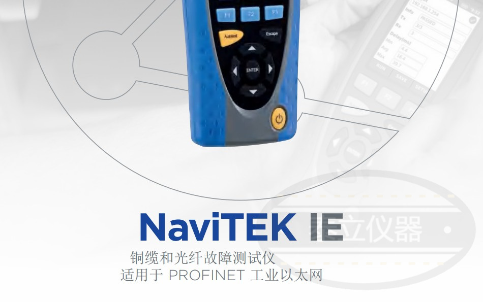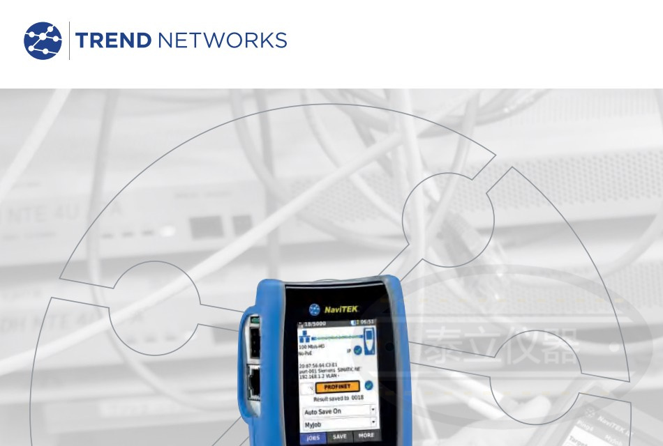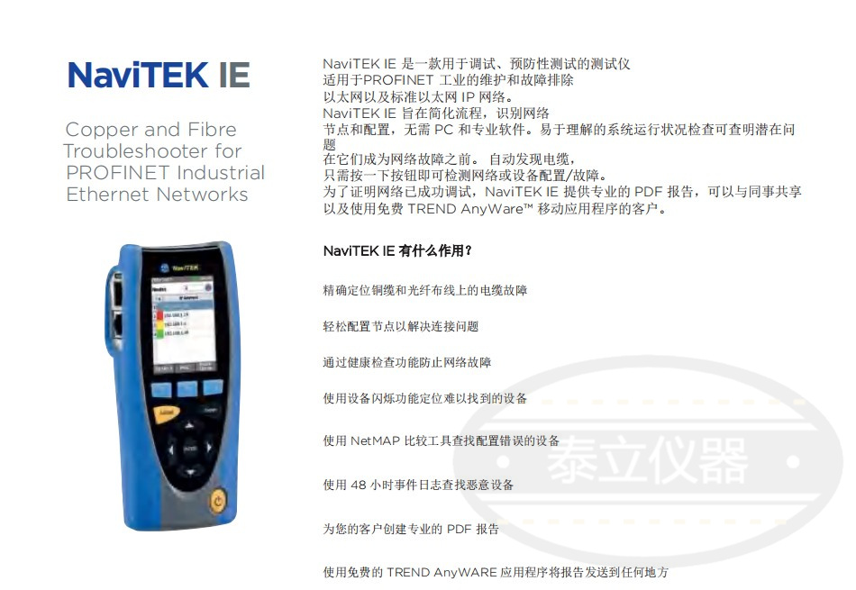 -     英国TREND光纤故障测试仪NaviTEK IE R151010详细信息| 询价留言品牌:英国TREND 型号:R151010 加工定制:否 测量范围:广 测量精度:高精度 电源电压:3 V 尺寸:175*80*40 mm 重量:0.4 kg 用途:光纤故障测试 英国TREND NETWORKS铜缆和光纤故障测试仪NaviTEK IE NAVITEK IE – PROFINET 测试仪R151010 PROFINET 测试仪用于工业以太网的故障排查 PROFINET 测试仪 NAVITEK IE 用于工业以太网的开通,预防性维护 和故障排查,同时也支持标准以太网的测试。 发现铜缆和光纤故障原因 轻松配置节点以解决生产现场故障复位问题 使用网络健康测试功能预防和查找网络故障 使用设备指示灯闪烁功能定位到具体设备 使用 NetMAP 比较网络的变化,快速查找错误配置的设备 提供48小时在线监测并生成事件日志,便于查找期间出现的问题 概览 NAVITEK IE – PROFINET 测试仪 网络诊断过程非常便捷, NaviTEK IE 可以在不需要PC 机和专用软件的情况下识别网络节点和配置节点网络参数。 简单直观的网络健康测试系统可以帮助我们在网络故障爆发之前定位并找出潜在的问题。只需要一个按键即可自动发现电缆,网络或设备的配置问题。 为了证明网络已经成功地投入使用或问题分析,NaviTEK IE 提供的PDF 报告,分享给免费手机 APP TREND AnyWare™ 的用户。