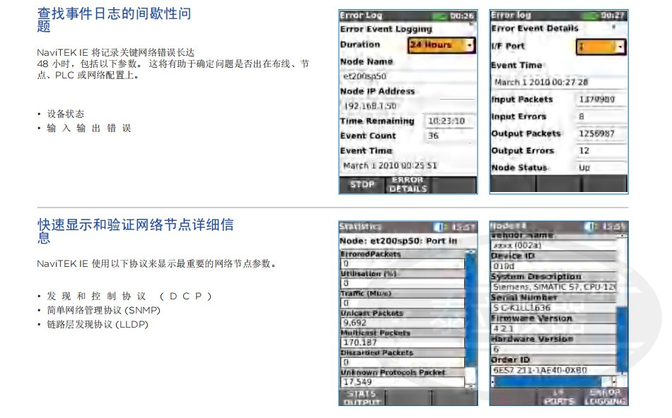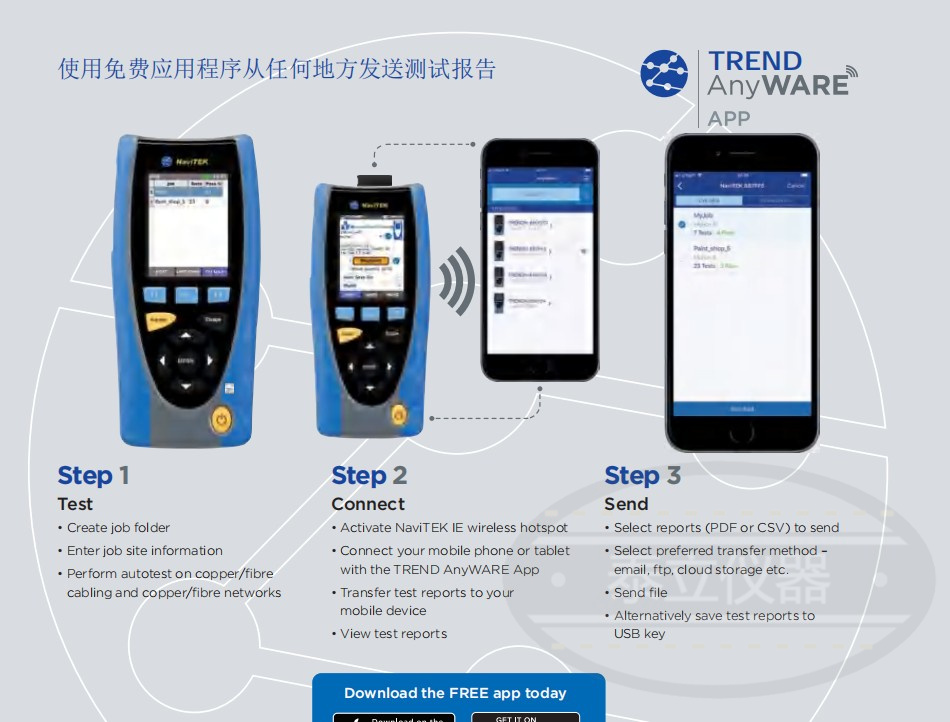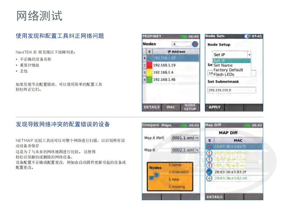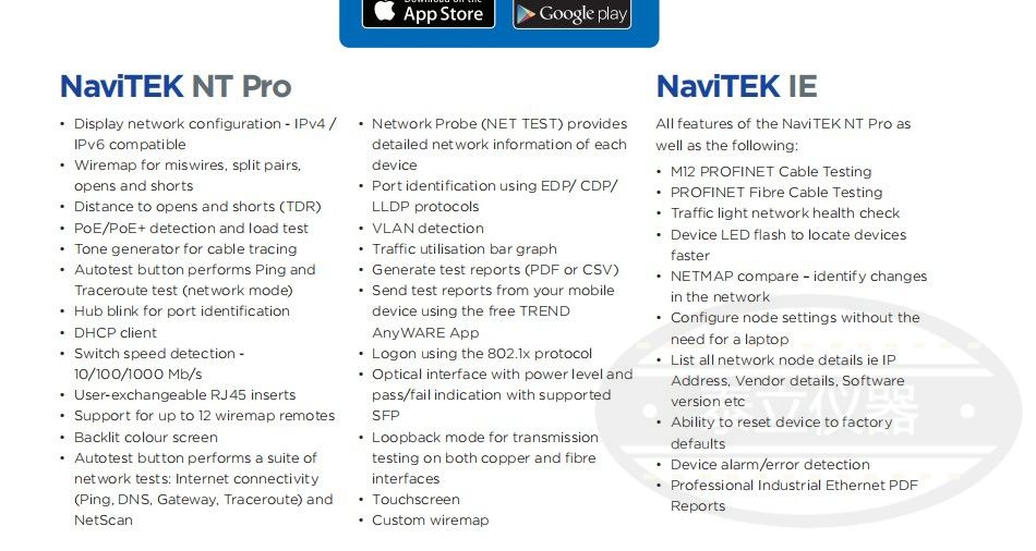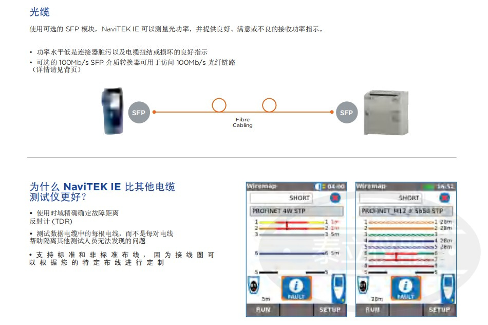 产品功能 NaviTEK IE 可以做什么? ✔ 发现铜缆和光纤故障原因 ✔ 轻松配置节点以解决生产现场故障复位问题 ✔ 使用网络健康测试功能预防和查找网络故障 ✔ 使用设备指示灯闪烁功能定位到具体设备 ✔ 使用 NetMAP 比较网络的变化,快速查找错误配置的设备 ✔ 提供48小时在线监测并生成事件日志,便于查找期间出现的问题 ✔ 为客户创建PDF报告 ✔ 使用免费的手机App轻松分享测试报告