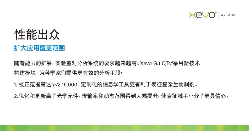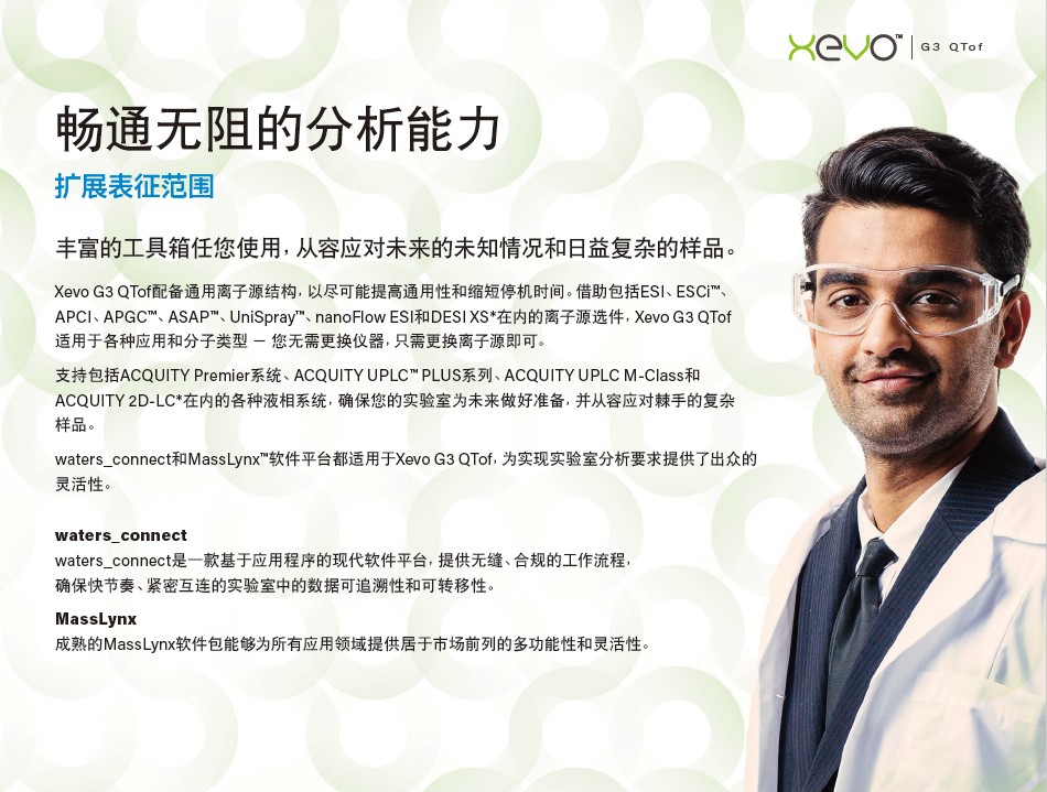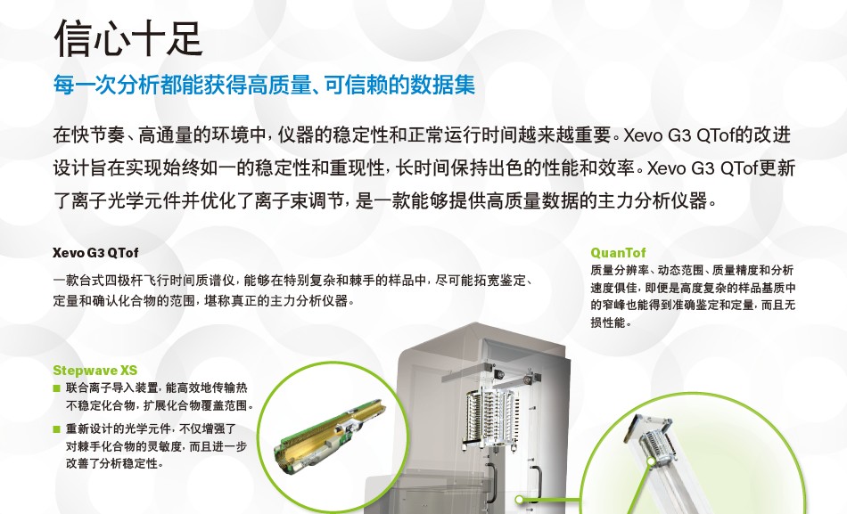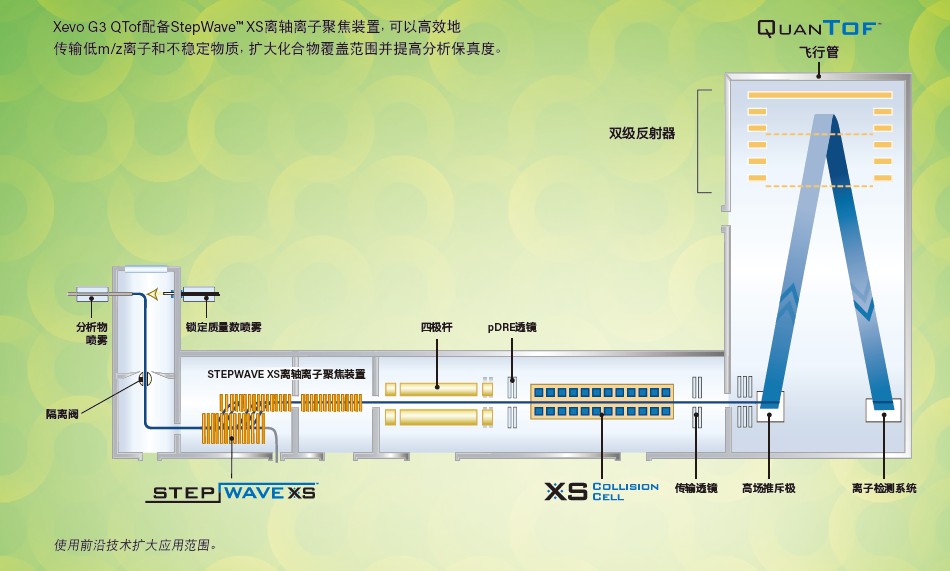 借助QuanTof(全新维度的高分辨率精确质量数MS)、StepWave(可确认痕量成分)、Triwave(表征复杂混合物)和MSE(为样品生成精确质量数离子谱图)技术,为您开拓源源不断的可能。