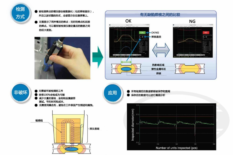 ●被检测焊点的情况都会被数据化(包括焊核直径),并且以波状图的形式,全部显示在仪避屏幕上,