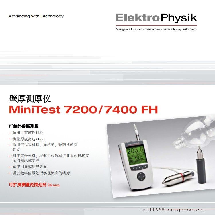 德国EPK MiniTest 7200/7400 FH壁厚测厚仪又名霍尔效应测厚仪是便携式的厚度测量工具,可准确测量厚达24 mm的材料。便携而小巧的外形使其可在生产现场和实验室进行操作。两个型号可以再各种非磁性材料上 进行简单、无损和高精度的厚度测量,无论它们的大小、形状和材质如何。它们是精确测量尖角、小半径和复杂形状工件所需的理想工具。