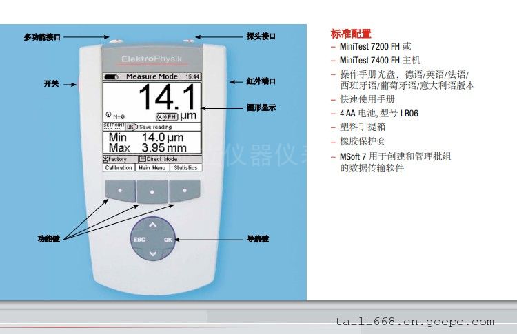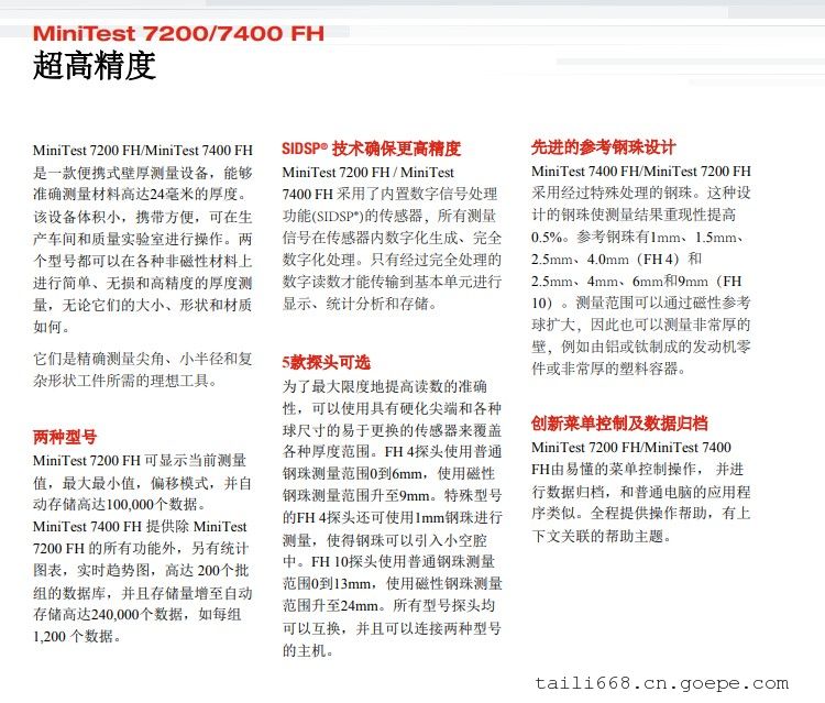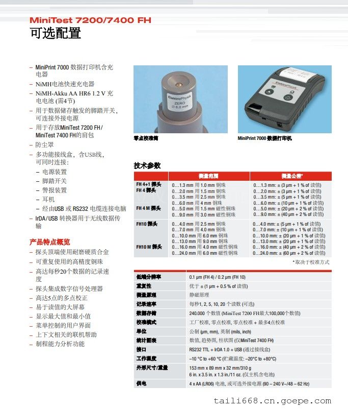 德国EPK 壁厚测厚仪MiniTest 7200 / 7400 FH - 技术参数测量范围 测量公差* FH 4 探头 0…1.3 mm 用 1.0 mm 钢珠测 0…1.3 mm: ± (3 μm + 1% 读值) 0…2.0 mm 用 1.5 mm 钢珠测 0…2.0 mm: ± (3 μm + 1% 读值) 0…3.5 mm 用 2.5 mm 钢珠测 0…3.5 mm: ± (5 μm + 1% 读值) 0…6.0 mm 用 4 mm 钢珠测 0…6.0 mm: ± (10 μm + 1% 读值) 0…5.0 mm 用 1.5 mm 磁性钢珠测 0…5.0 mm: ± (20 μm + 2% 读值) 0…9.0 mm 用 3.0 mm 磁性钢珠测 0…9.0 mm: ± (40 μm + 2% 读值) FH10 探头 0…2.5 mm 用 4.0 mm 钢珠测 0…4.0 mm: ± (5 μm + 1% 读值) 0…7.0 mm 用 4.0 mm 钢珠测 0…7.0 mm: ± (10 μm + 1% 读值) 0…10.0 mm 用 6.0 mm 钢珠测 0…10.0 mm: ± (20 μm + 1% 读值) 0…13.0 mm 用 9.0 mm 钢珠测 0…13.0 mm: ± (20 μm + 1% 读值) 0…16.0 mm 用 4.0 mm 磁性钢珠测 0…16.0 mm: ± (40 μm + 2% 读值) 0…24.0 mm 用 6.0 mm 磁性钢珠测 0…24.0 mm: ± (60 μm + 2% 读值) 低端分辨率 0.1 μm (FH 4) / 0.2 μm (FH 10) 重复性 优于 ± (1 μm + 0.5 % 读值) 测量原理 静磁原理 记录速率 1, 2, 5, 10, 20 个读值每秒(可选) 数据存储 240.000 个值 (MiniTest 7200 FH*多100,000 个值) 校准模式 出厂设置, 零点校准, 零点 + 多达4点校准 测量单位 公制 (μm, mm),英制(mils, inch) 统计图表 数字,趋势图,柱状图(仅限MiniTest 7400 FH) 接口 RS232 TTL + IrDA 1.0 + USB (通过接线盒) 操作温度 –10 °C to +60 °C (储存温度: –20°C to +80°C) 尺寸/重量 153 mm x 89 mm x 32 mm/310 g 6 in. x 3.5 in. x 1.3 in./11 oz. (仅主机带电池) 供电 4 x AA (LR06) 电池, 或 可选外接电源 (90 – 240 V~/48 – 62 Hz) * 与校准模式有关