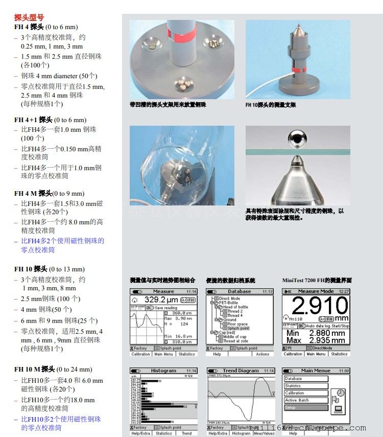 FH 10探头使用普通钢珠测量范围从0到13 mm而使用磁性钢珠可测量高达24mm。两种型号的探头可以互换,并且可以连接两种主机型号。