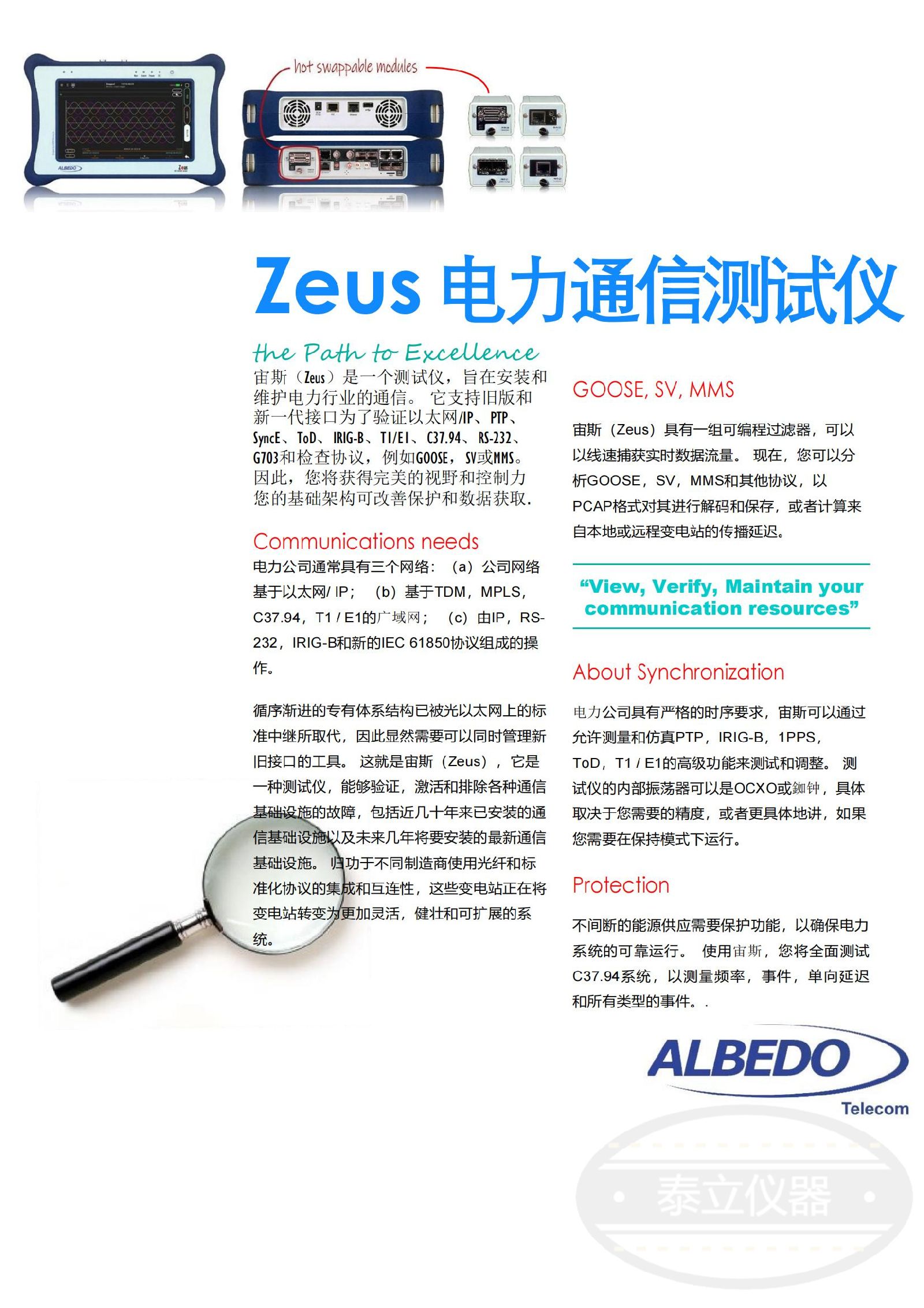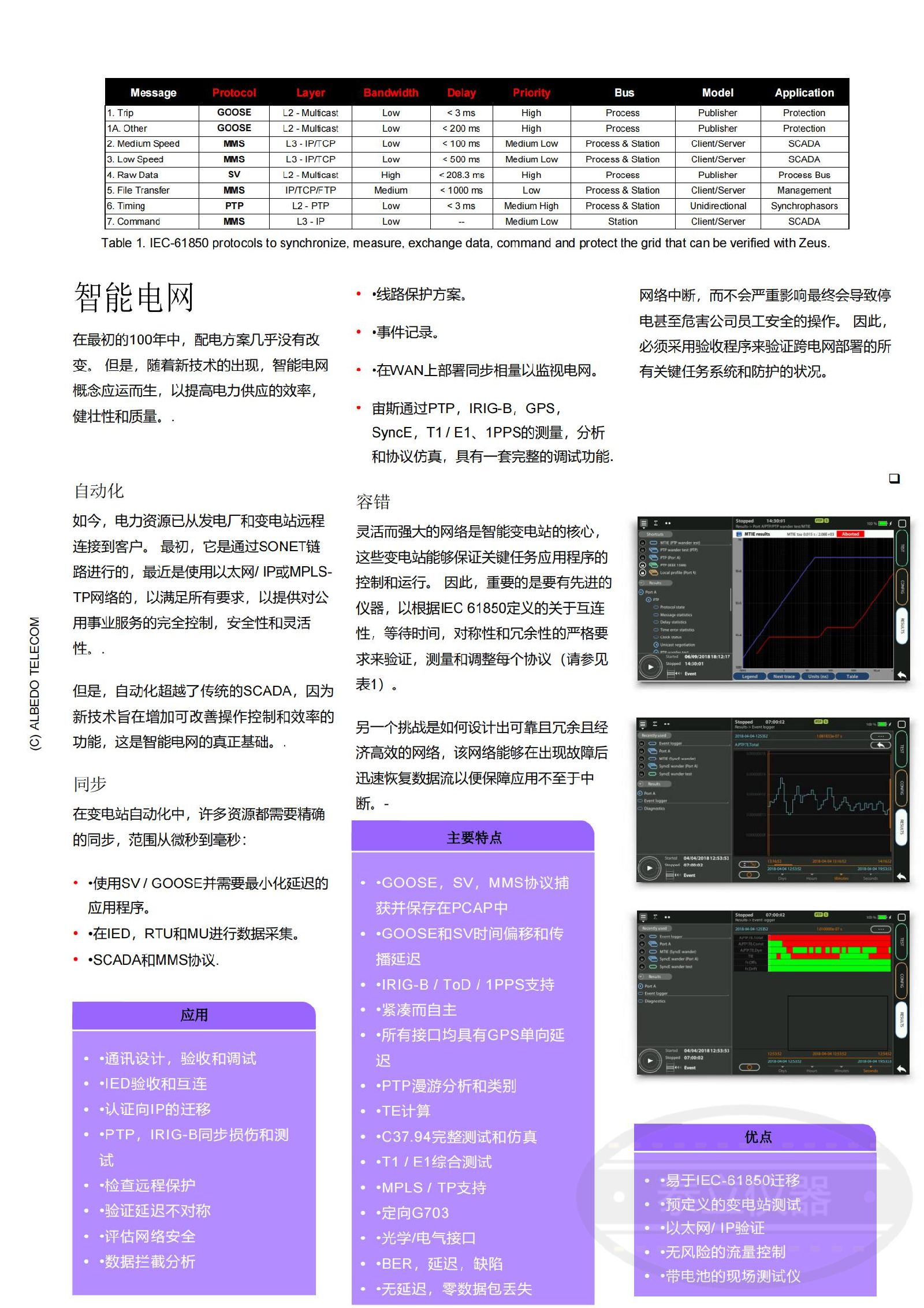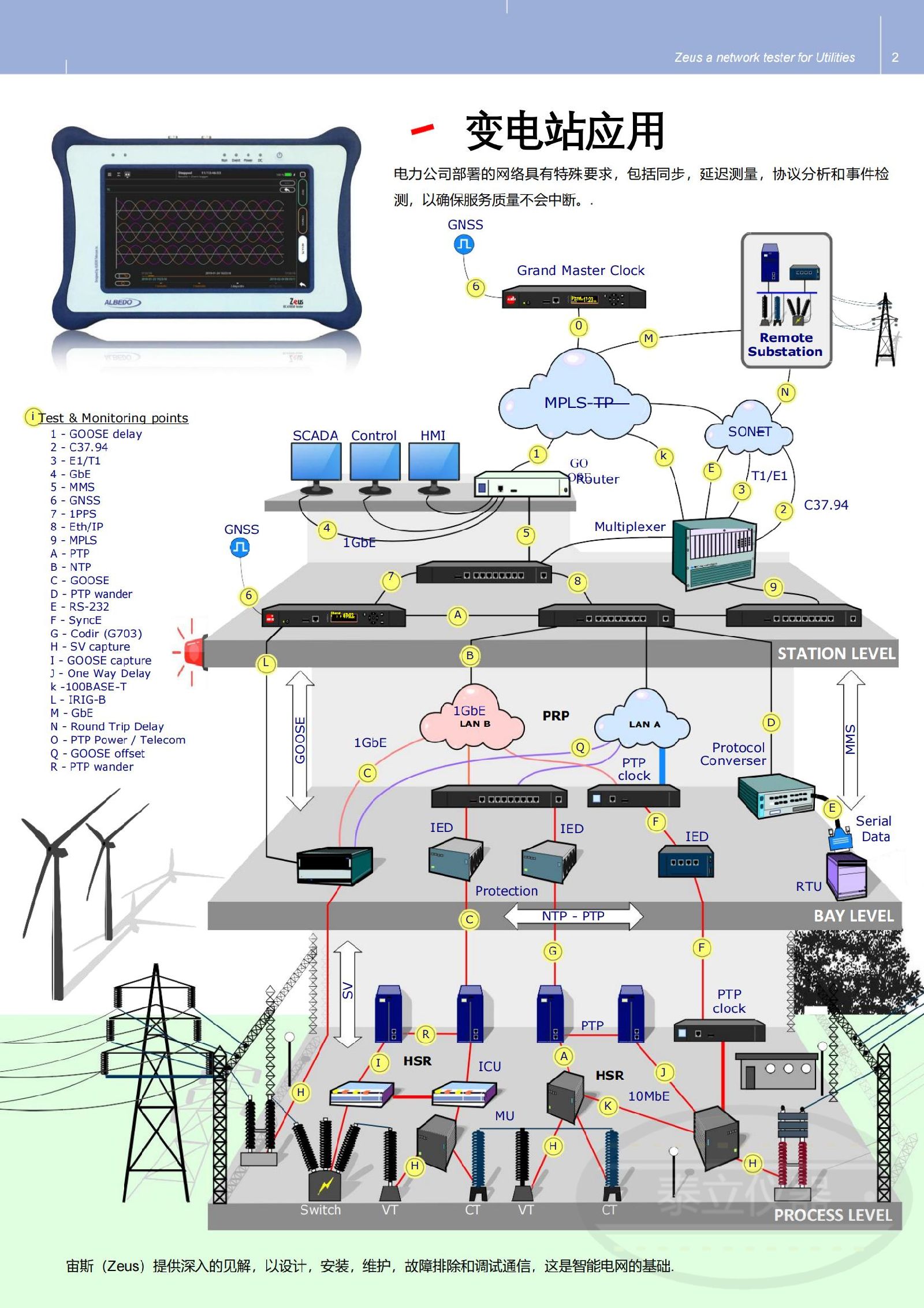 -     西班牙Albedo电力通信综合测试平台Zeus详细信息| 询价留言品牌:西班牙Albedo 型号:Zeus 质保:一年 组成部分:手持式 重量:1 ㎏ 外形尺寸:223x144x65 mm 电源电压:充电池 功耗:5 w 适应领域:航天;航空;电子;舰船;核能;交通;通信;自动控制;高速机车 西班牙Albedo电力通信综合测试平台Zeus 产品描述 宙斯(Zeus)是一款用于安装和维护电力行业的通信的综合测试平台,可以用于设计,安装,维护和解决智能电网的通信基础结构。 该装置能够测试以太网/IP,PTP,SyncE,ToD,IRIG-B,T1/E1,C37.94,RS-232,G703和协议,如 GOOSE,SV 或 MMS。 可进行的单向延迟测试,并带有一组集成的可编程滤波器,以线速捕获实时数据流量。 电力公司部署的网络具有特殊要求,包括同步,延迟测量,协议分析和事件检测,以确保无中断地提供优质的电力。 电网的自动化需要定时进行应用,例如高峰时段计费,虚拟能源管理,保护故障控制以及关联能源的产生/需求。 SynchroPhasors部署在整个电网中,也是检查的重要元素,以确保其监视和弹性功能运行。 保护继电器的传输链路的可靠性至关重要,因此它们必须对高电压/高频率感应和地电位上升的影响具有弹性。这就是为什么公用事业已转移到光学介质以连接并置在变电站中的不同物品的原因。 Zeus可以通过允许测量和仿真PTP,IRIG-B,1PPS,ToD,T1 / E1的高级功能来测试和调整所有这些元素。还包括一组可编程过滤器,以线速捕获实时数据流量。 现在,您可以分析GOOSE,SV,MMS和其他协议,以PCAP格式对其进行解码和保存,或者计算来自本地或远程变电站的传播延迟。 特色和优点 GOOSE,SV,MMS协议捕获并以PCAP格式保存以进行分析 GOOSE,SV数据包时间偏移 I / O时间参考:IRIG-B,PTP,SyncE,T1 / E1、10 / 2 / 1.5 Mb / s,1PPS,1PP2S,ToD,GNSS 内部振荡器:,, OCXO PTP主/从 SyncE / PTP漂移分析/生成 完整的T1 / E1测试抖动/漂移,脉冲 GPS不对称或单向延迟 数据通信:V11,V24,V35,V36,EIA530,EIA530A,目录 C37.94分析/生成 SNMP / MIB支持