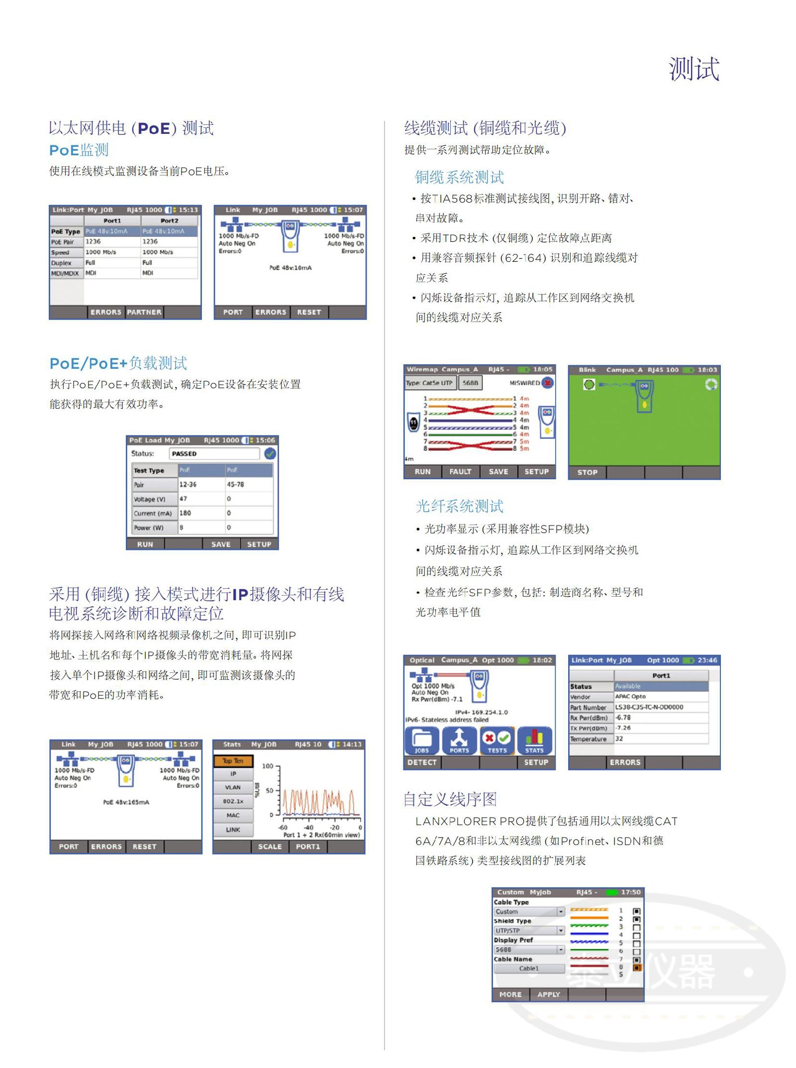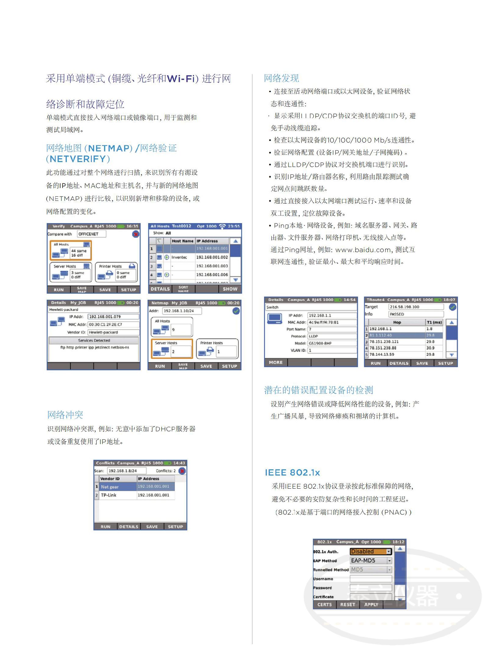 - 线缆故障排除 – 时域反射计/故障点测量 网络验证测试 – 跟踪 LAN/互联网的安装、移动、添加和变更