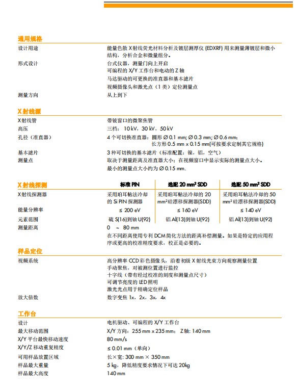 X 射线荧光材料分析及镀层测厚仪,配备可编程运行 X/Y 工作台及 Z 轴升降系统,全自动测量超薄镀层厚度和分析材料成分。