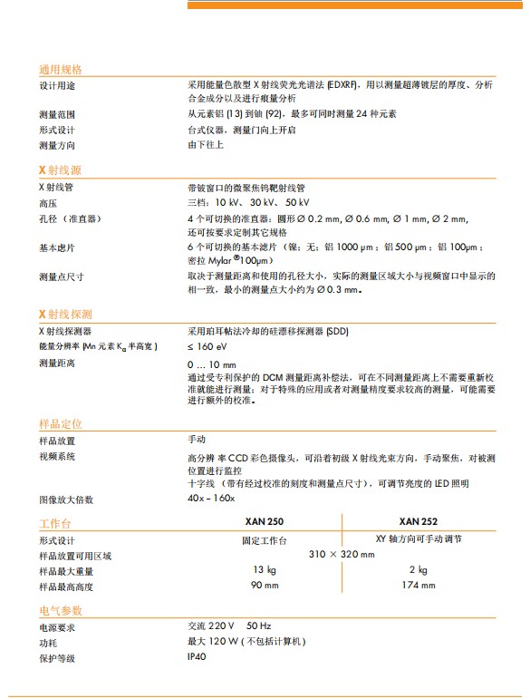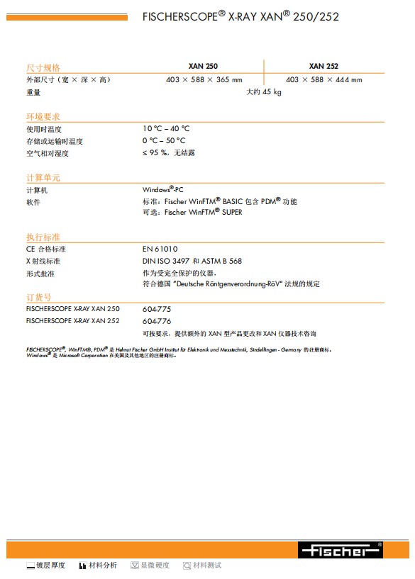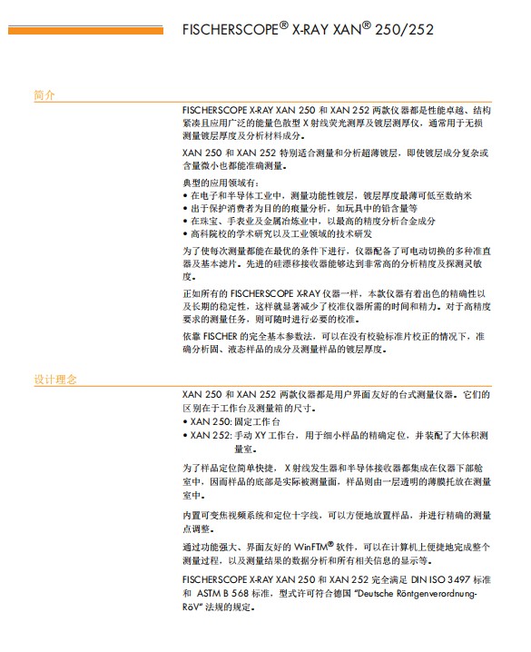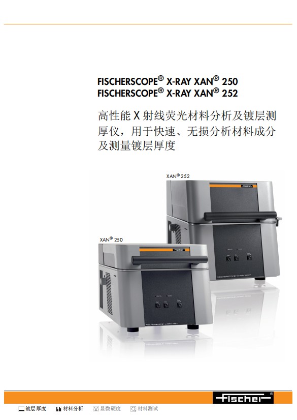 德国Fischer测量分析超薄镀层厚度仪器 XRAY XAN 250 和 XAN 252 简介 FISCHERSCOPE XRAY XAN 250 和 XAN 252 两款仪器都是结构紧凑且应用广泛的能量色散型X射线荧光测厚及镀层测厚仪,通常用于无损测量镀层厚度及分析材料成分。 XAN 250 和 XAN 252 特别适合测量和分析超薄镀层,即使镀层成分复杂或含量微小也都能准确测量。 典型的应用领域 ·在电子和半导体工业中,测量功能性镀层,镀层厚度*薄可低至数纳米 ·出于保护消费者为目的的痕量分析,如玩具中的铅含量等 ·在珠宝、手表业及金属冶炼业中,以*高的精度分析合金成分 ·高科院校的学术研究以及工业领域的技术研发 为了使每次测量都能在良好的条件下进行,仪器配备了可电动切换的多种准直器及基本滤片。先进的硅漂移接收器能够达到非常高的分析精度及探测灵敏度。 正如所有的 FISCHERSCOPE XRAY 仪器一样,本款仪器有着出色的精确性以及长期的稳定性,这样就显著减少了校准仪器所需的时间和精力。对于高精度要求的测量任务,则可随时进行必要的校准。 依靠 FISCHER的基本参数法,可以在没有校验标准片校正的情况下,准确分析固、液态样品的成分及测量样品的镀层厚度。 德国FISCHER荧光测厚及材料分析仪XRAY XAN 250 和 XAN 252 XAN 250 和 XAN 252 两款仪器都是用户界面友好的台式测量仪器。它们的区别在于工作台及测量箱的尺寸。 ·XAN 250:固定工作台 ·XAN 252: 手动 XY 工作台,用于细小样品的精确定位,并装配了大体积测量室。 为了样品定位简单快捷,X射线发生器和半导体接收器都集成在仪器下部舱室中,因而样品的底部是实际被测量面,样品则由一层透明的薄膜托放在测量室中。 内置可变焦视频系统和定位十字线,可以方便地放置样品,并进行精确的测量点调整。 通过功能强大、界面友好的 WinFTM·软件,可以在计算机上便捷地完成整个测量过程,以及测量结果的数据分析和所有相关信息的显示等。 FISCHERSCOPE XRAY XAN 250 和 XAN 252 满足 DIN ISO 3497 标准和 ASTM B 568 标准,型式许可符合德国“Deutsche Röntgenverordnung-RöV"法规的规定。