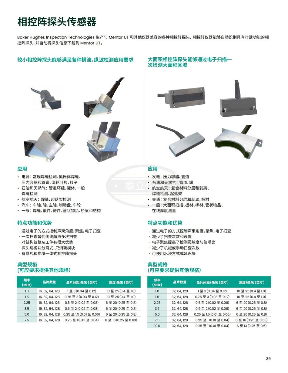 应用·电源:常规焊缝检测、奥氏体焊缝、压力容器和管道、涡轮叶片、转子 ·石油和天然气:管道环缝、罐体、一般焊缝检测 ·航空航天:焊缝、起落架检测 ·汽车:车轴、轴、主轴、制动盘、车轮 ·一般:焊缝、锻件、铸件、管状物品、桥梁和结构