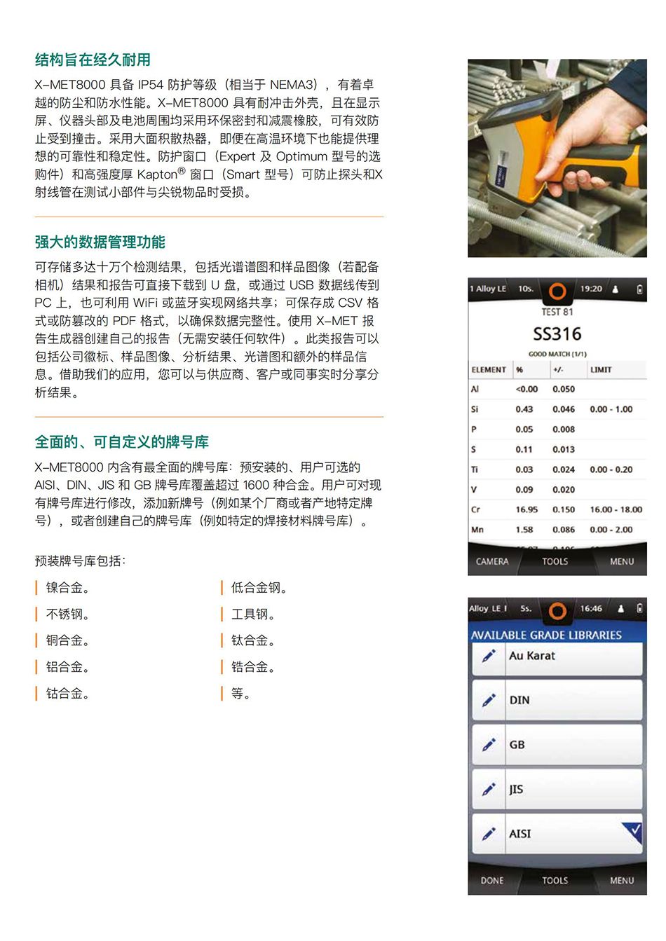 X-MET8000 内含有全面的牌号库:预安装的、用户可选的 AISI、DIN、JIS 和 GB 牌号库覆盖超过 1600 种合金。用户可对现有牌号库进行修改,添加新牌号(例如某个厂商或者产地特定牌号),或者创建自己的牌号库(例如特定的焊接材料牌号库)。