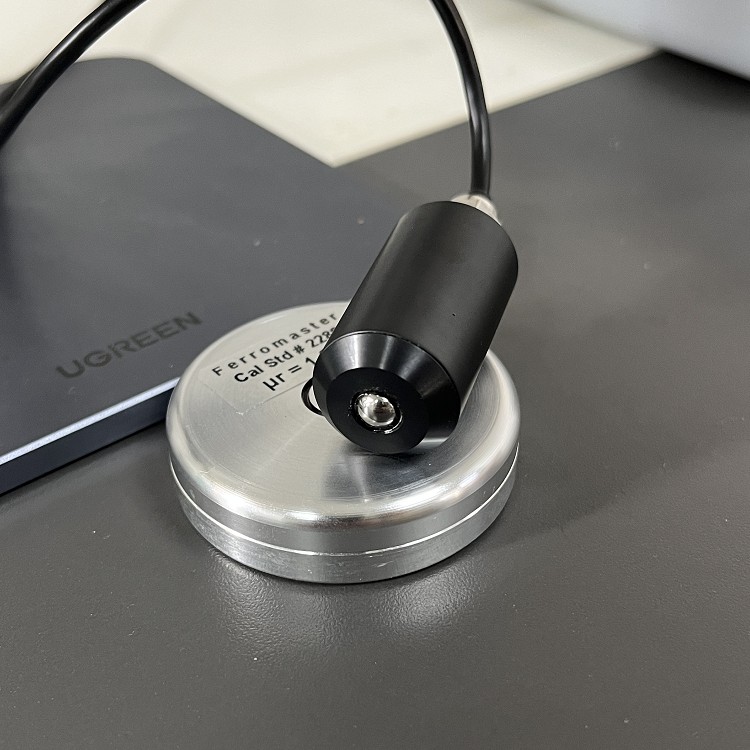 仪器出厂前已经按国家物理实验室(英国)标准进行标定。为了准确地测出磁导率,每台仪器都具有标定操作的功能。为了核查校准,磁导率仪器的探针需垂直放在标准试样上,让针尖接触到试样的中心,所测得的值应与试样标签上所打印的标准值相一致。标定值可以通过螺丝刀转动放在仪器顶部的微调装置来调整。保护好标定结果,防止仪器承受机械负载或暴露于强磁场当中。