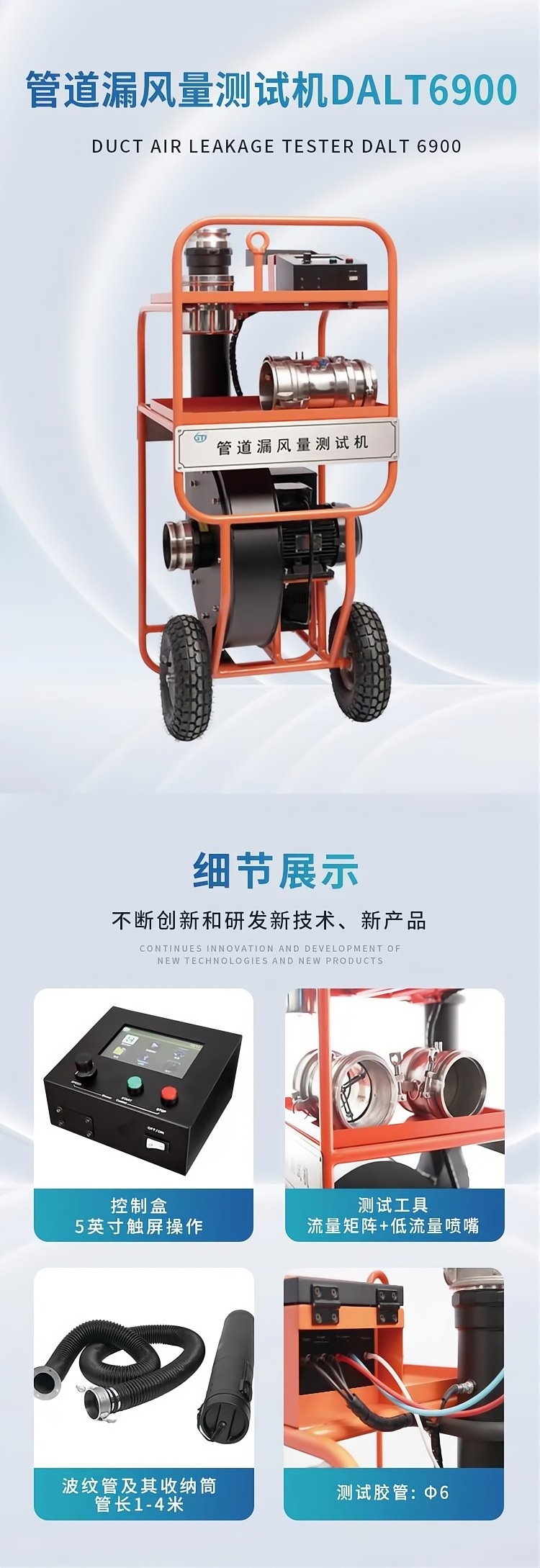 管道漏风量测试机主要用于空调管道的密封性测试,可对分段管道和整个系统安装后的总管道进行检测,空调系统的工作效率,避免能源浪费。本仪器根据相关的鉴定标准进行检测,可直接确定管道的密封性。