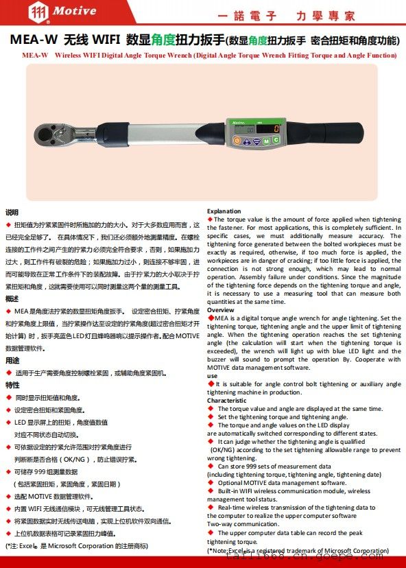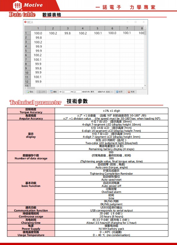 概述MEA是角度法拧紧的数显扭矩角度扳手。 设定密合扭矩、拧紧角度和拧紧角度上限值, 当拧紧操作达至设定的拧紧角度(超过密合扭矩才开始计算) 时, 扳手亮蓝色 LED 灯且蜂鸣器响以提示操作者。配合 MOTIVE 数据管理软件。