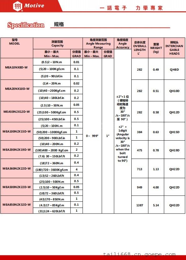 规格尺寸型号 扭矩范围 分度值 额定扭矩值的105% 额定扭矩值的3.3% 自动清零区间(额定扭矩值的7.5%) *小值 *大值 过载报警点 峰值保持点 MEA10N1D4 (0.5)2 10 0.01 10.50 0.33 0.75 MEA20N3D8 (1)4 20 0.02 21.00 0.67 1.5 MEA50N3D8 (2.5)10 50 0.05 52.50 1.67 3.75 MEA100N1D2 (5)20 100 0.1 105.0 3.3 7.5 MEA200N1D2 (10)40 200 0.2 210.0 6.7 15.0 MEA360N1D2 (18)72 360 0.4 378.0 12.0 27.0 MEA500N3D4 (25)100 500 0.5 525.0 16.7 37.5 MEA850N3D4 (43)170 850 1 893 28 64 -