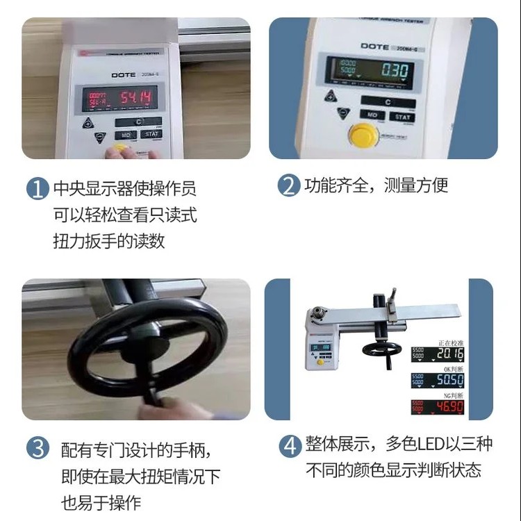 适用于各类扭力扳手校准,水平固定的均匀加载装置可确保一致、准确性高且重复性高的结果。多色LED以三种不同的颜色显示判断状态。