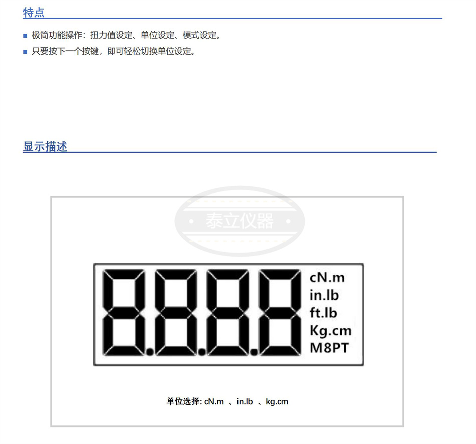 特点1.极简功能操作:扭力值设定、单位设定、模式设定。
