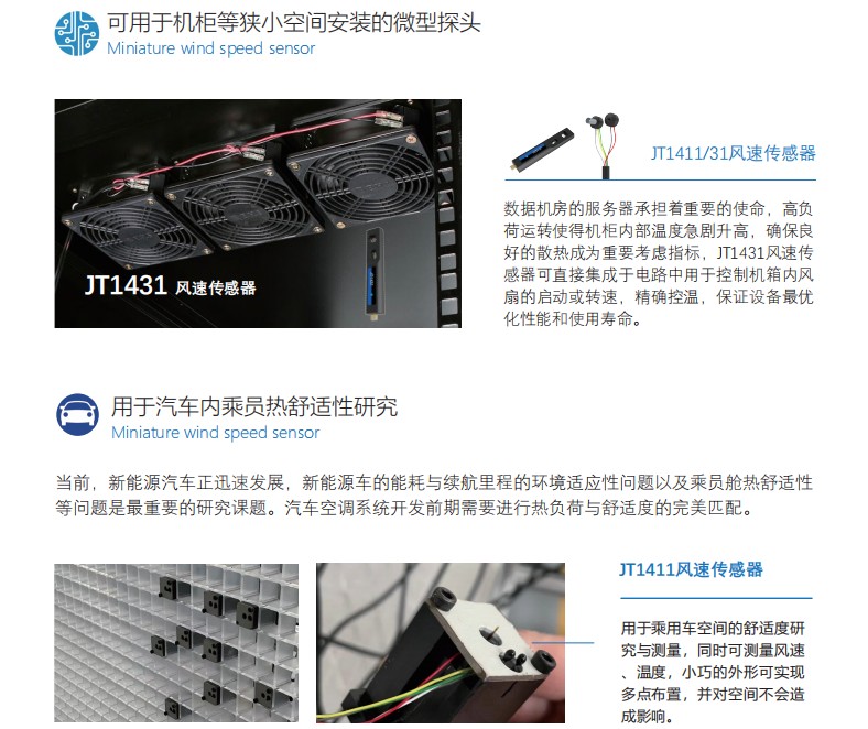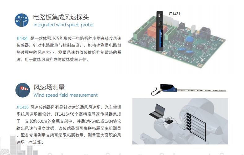 JT1431是一款体积小巧能集成于电路板的小型高精度风速 传感器,针对电路散热与控制而设计,能精确测量电路散 热过程中的风速大小,测量风速数值传输给控制散热的系 统,用于散热风扇控制与散热效率评估。