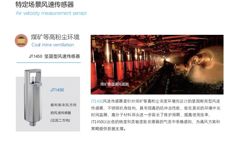 JT1450风速传感器是针对煤矿等高粉尘浓度环境而设计的坚固耐用型风速 传感器,不锈钢机身结构,具有很高的抗冲击性能,能在恶劣的环境中长 时间监测,高分子材料探头进一步延长了维护周期,提高使用效率。 JT1450以出色的精度和灵敏度能在微弱的气流中准确感知,为通风方案和 策略提供数据支撑。