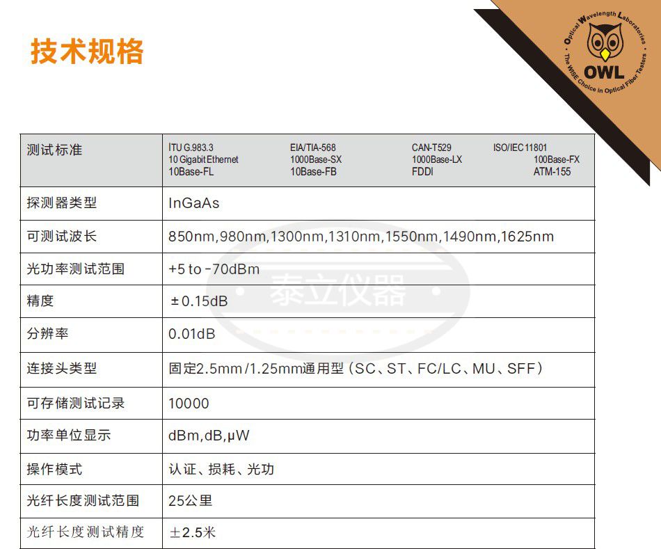 OWL使用行业标准,例如TIA,EIA,ISO/IEC,Telcordia标准和光纤测试程序(FOTP)。OWL测试设备可溯 源至美国国家标准与技术研究院(N.I.S.T.),确保每一台仪表都能够符合测试标准。