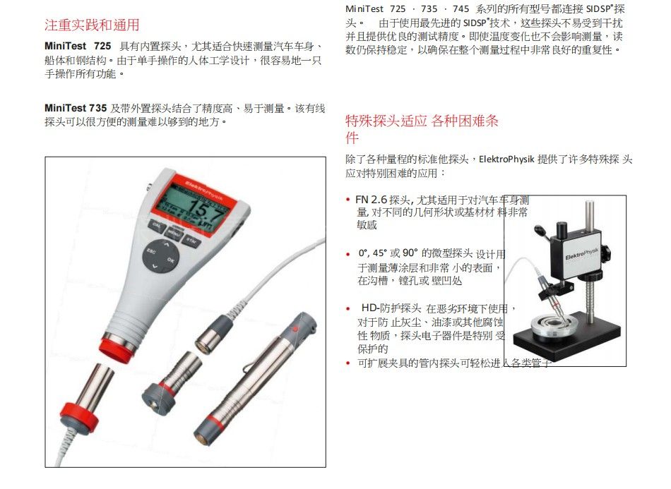 德国EPK涂层测厚仪MiniTest725/735/745ElektroPhysik 在表面处理行业的无损涂层测厚仪制造上有着超过60年的悠久传统。 典型应用于 铁基体上的非磁性涂层(如油漆、清漆、搪瓷、镀铬和镀锌); 或者有色金属上(如铜,铝,压铸锌,黄铜等)的绝缘涂层(如油漆、阳极氧化膜层或陶瓷)