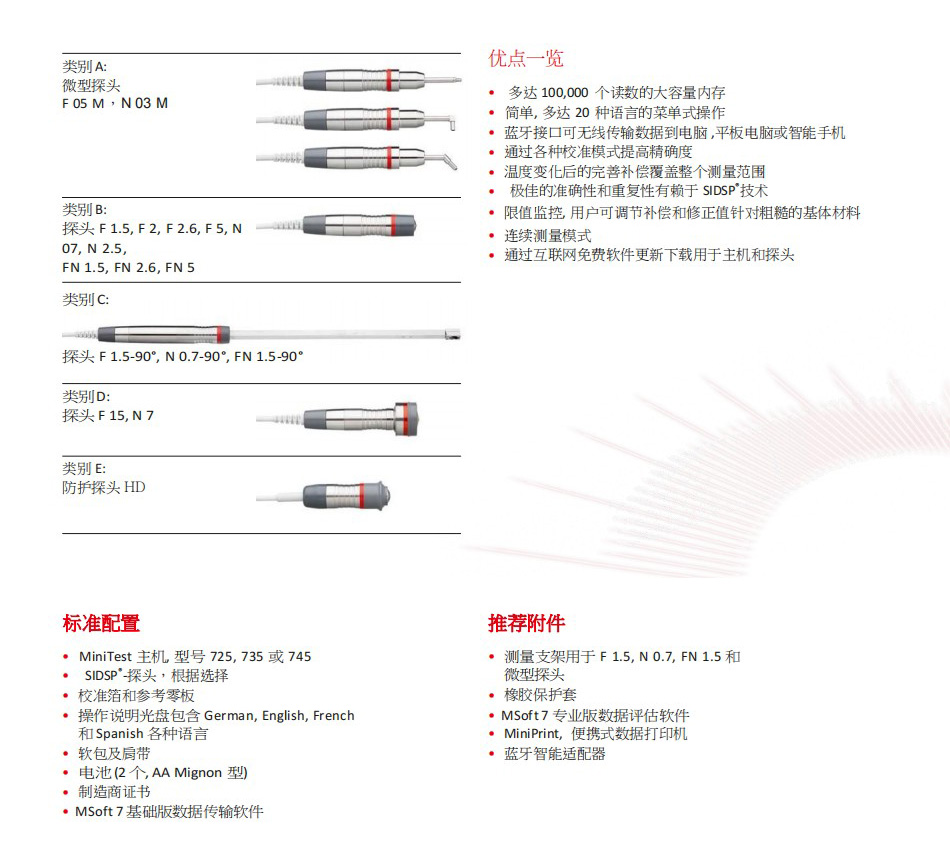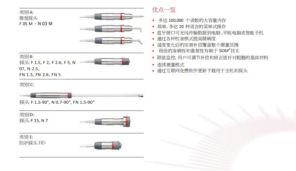 • 通过网络可免费更新探头软件优点一览 • 多达100,000 个读数的大容量内存 • 简单, 多达 20 种语言的菜单式操作 • 蓝牙接口可无线传输数据到电脑 ,平板电脑或智能手机 • 通过各种校准模式提高精确度 • 温度变化后的完善补偿覆盖整个测量范围 • 的准确性和重复性有赖于SIDSP®技术 • 限值监控, 用户可调节补偿和修正值针对粗糙的基体材料 • 连续测量模式 • 通过互联网免费软件更新下载用于主机和探头
