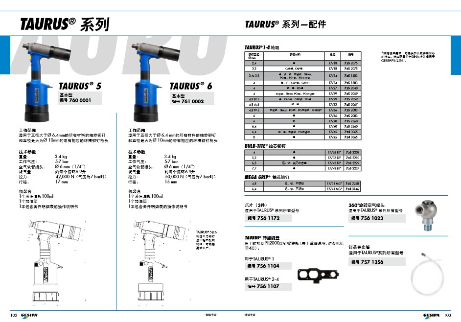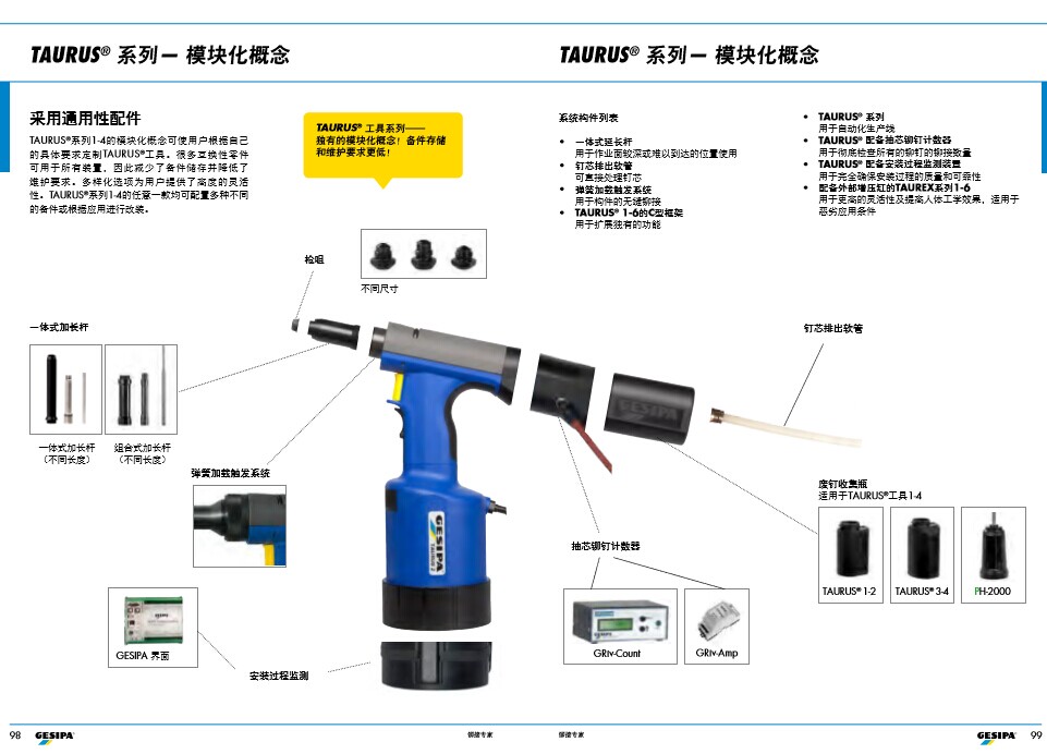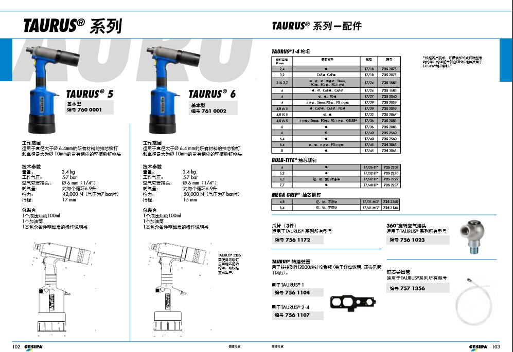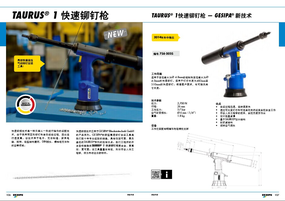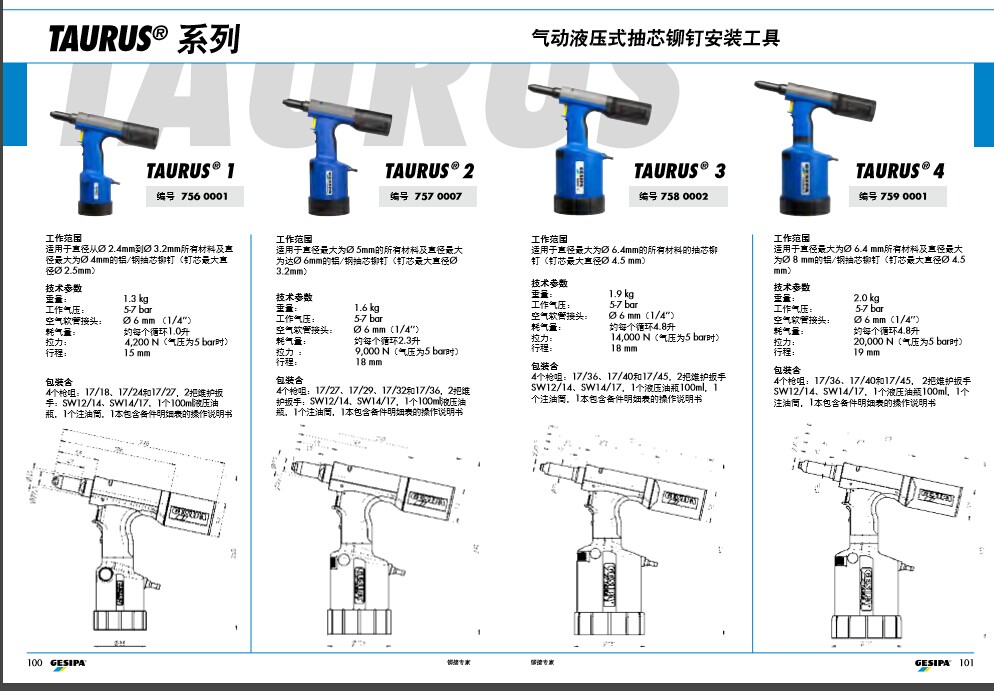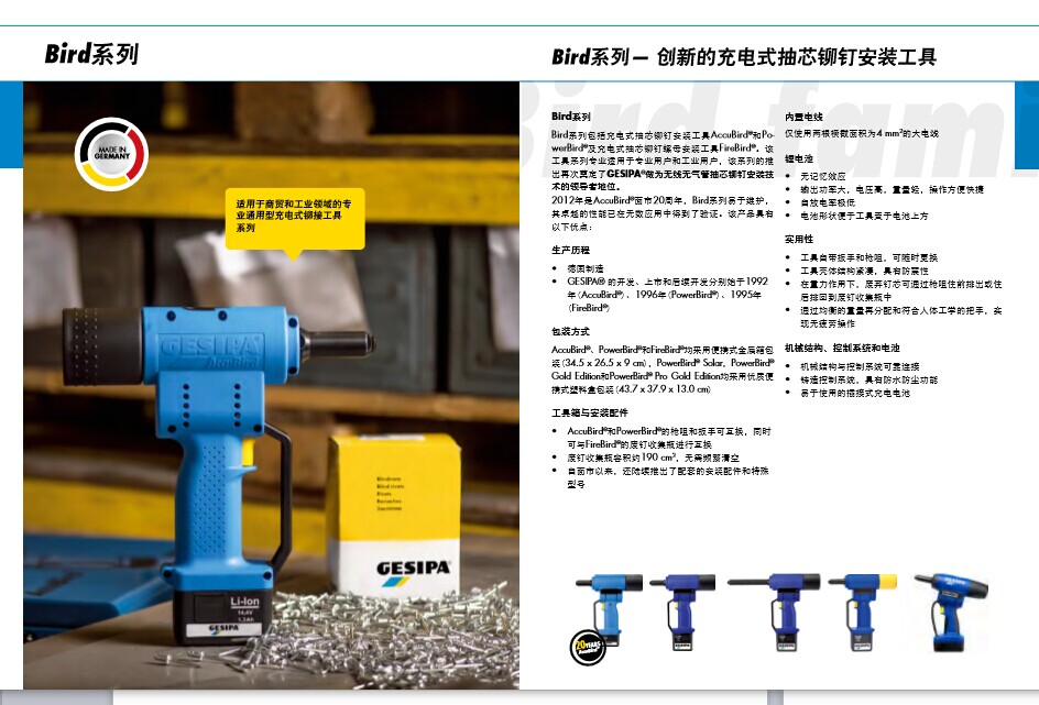 德国GESIPA气动铆钉枪GESIPA®技术产品如GAV全自动铆接机、不断开发的 充电式拉铆钉安装工具Pro Gold Edition系列、TAURUS®系 列、FireFox® 1和2铆螺母安装工具,在市场上占据了 地位。