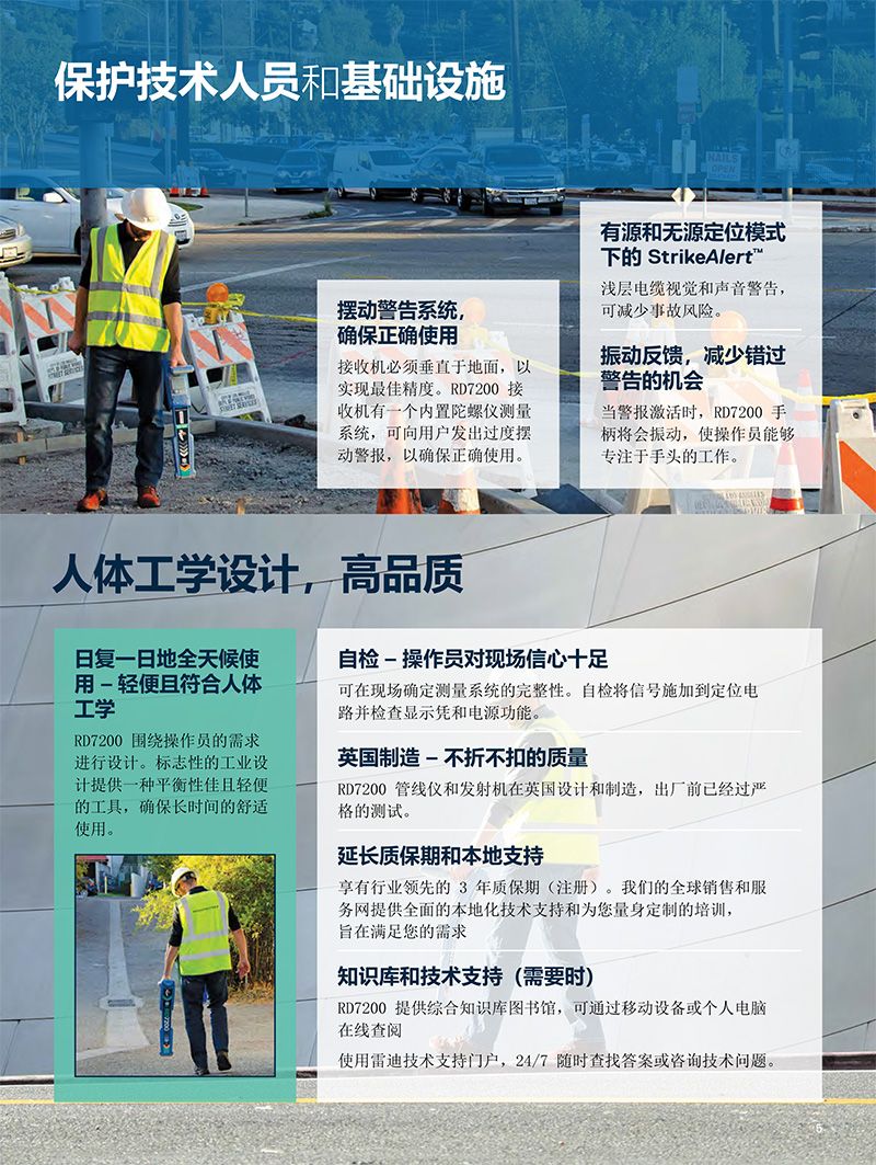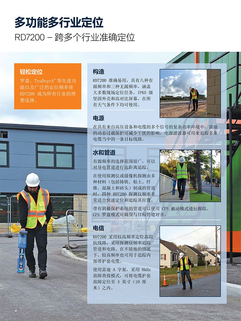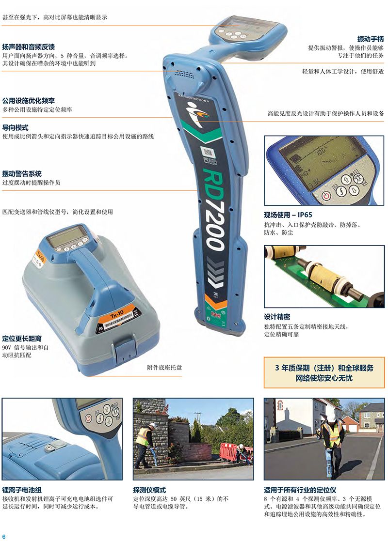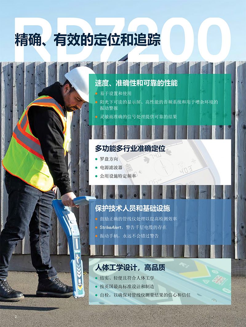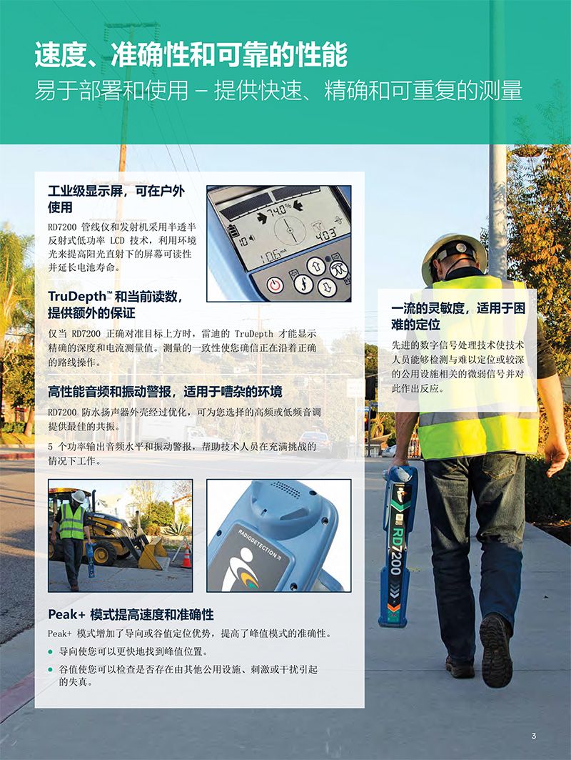 RD7200管线探测仪定位器和发射器采用透反射低功耗LCD技术,利用环境光提高屏幕在阳光直射下的可读性,延长电池寿命。高性能音频和振动警报,适用于噪音环境RD8200防水扬声器外壳经过调整,为您选择高频或低频音调提供共振。功率输出音频电平和振动警报,协助技术人员在有挑战性的情况下工作。RD8200系列定位器和变送器简化了在拥挤的网络、变电站或高压线路附近识别和跟踪公用设施的任务当前方向,追踪右线。