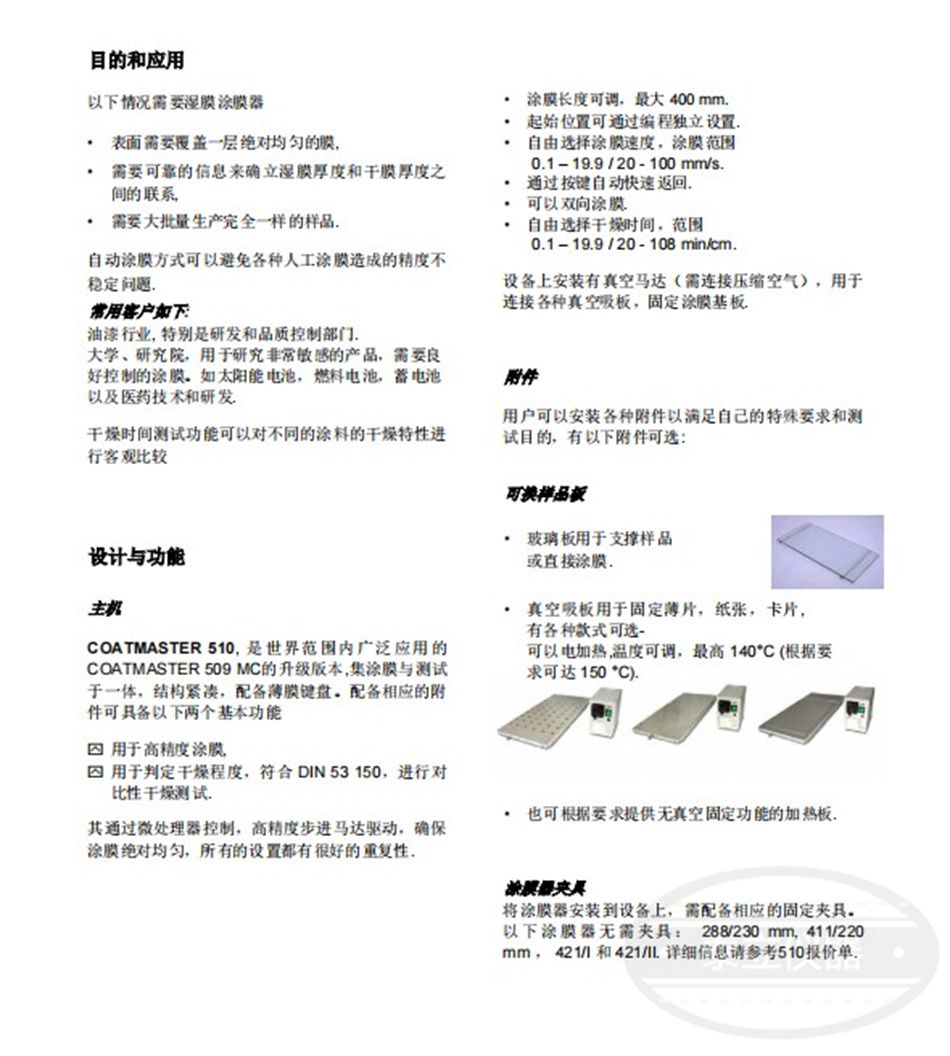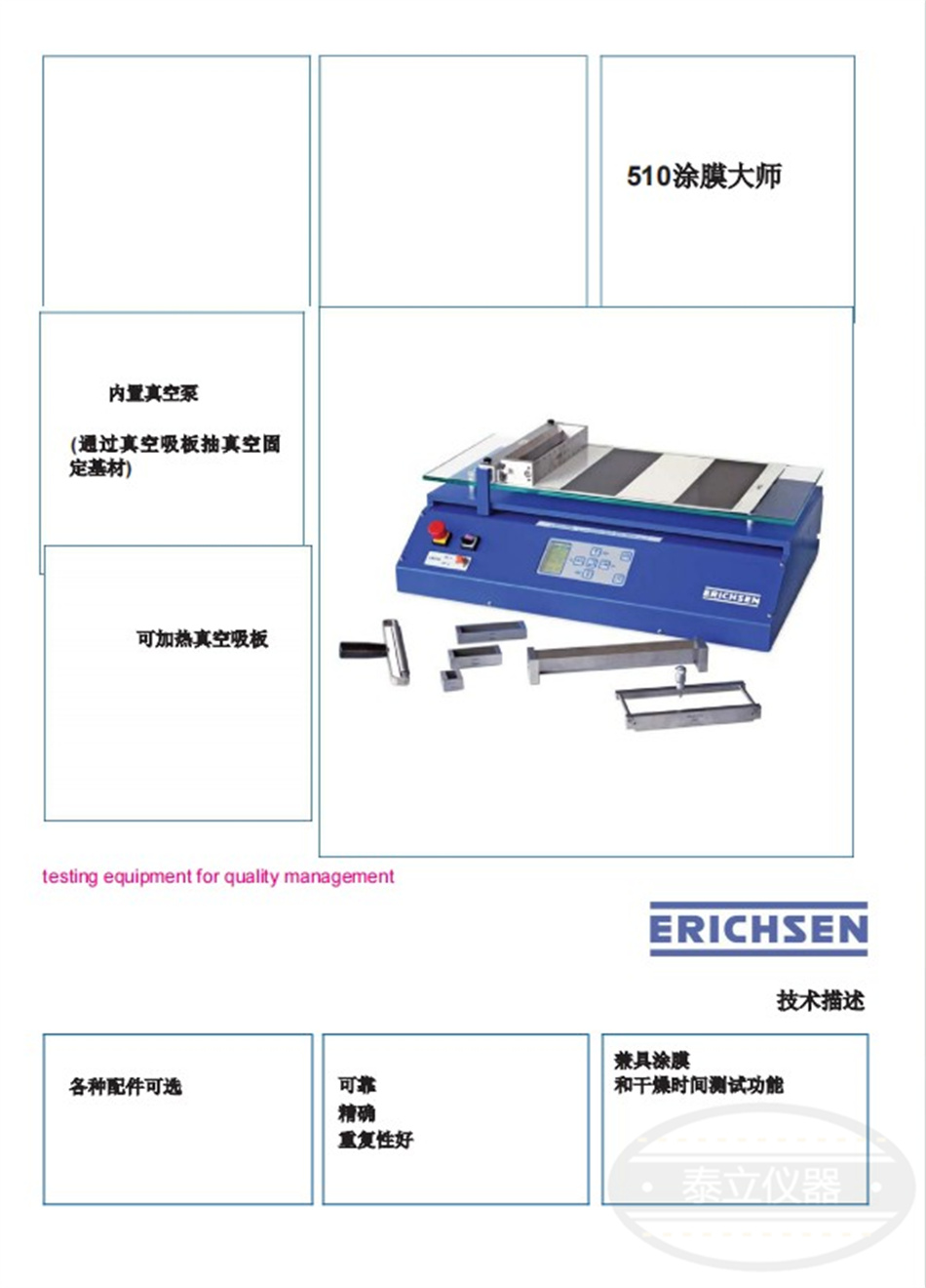德国ERICHSEN仪力信涂膜大师510型,是509涂膜大师的加强型升级版,是一个紧凑的、坚固的仪器,带有一个简便键盘;既是一款自动涂膜器,也是一款干燥时间测试及记录的设备,更是一款为涂层检测提供微机控制的精确的移动平台;510有非常丰富的选配附件或工具供用户选择,当它搭载不同的配件时,即可实现不同的功能。